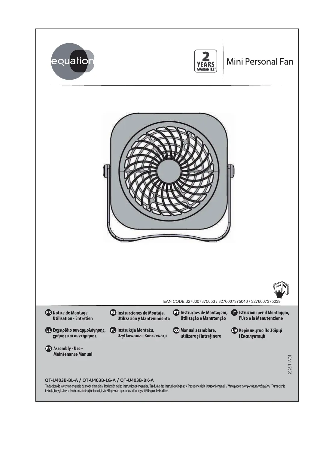 QT-U403B-BL-A / QT-U403B-LG-A / QT-U403B-BK-A - Ventilateur EQUATION - Notice d'utilisation et mode d'emploi gratuit