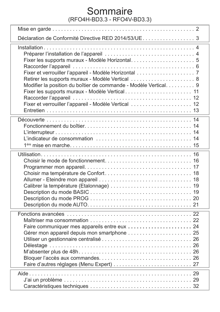 - Sommaire (RFO4H-BD3.3 - RFO4V-BD3.3) Mise en garde Déclaration de Conformité Directive RED 2014/53/UE Installation Préparer l'installation de l’appareil Fixer les supports muraux - Modèle Horizontal. Raccorder l'appareil Fixer et verrouiller l'appareil - Modèle Horizontal Retirer les supports muraux - Modèle Vertical Modifier la position du boîtier de commande - Modèle Vertical Fixer les supports muraux - Modèle Vertical Raccorder l'appareil Fixer et verrouiller l'appareil - Modèle Vertical Entretien oosourspsliuw ND Découverte Fonctionnement du boîtier L'interrupteur