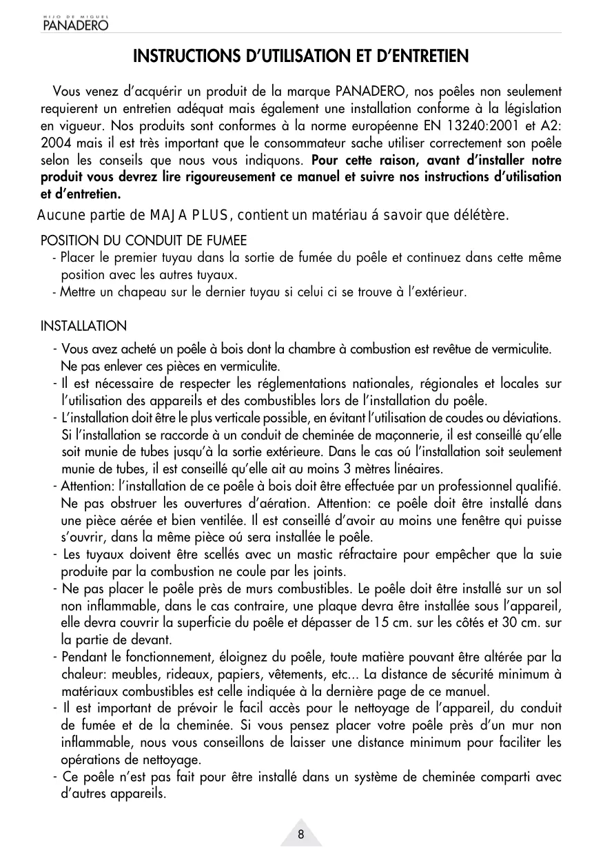 MAJA PLUS - Poêle à bois PANADERO - Notice d'utilisation et mode d'emploi gratuit