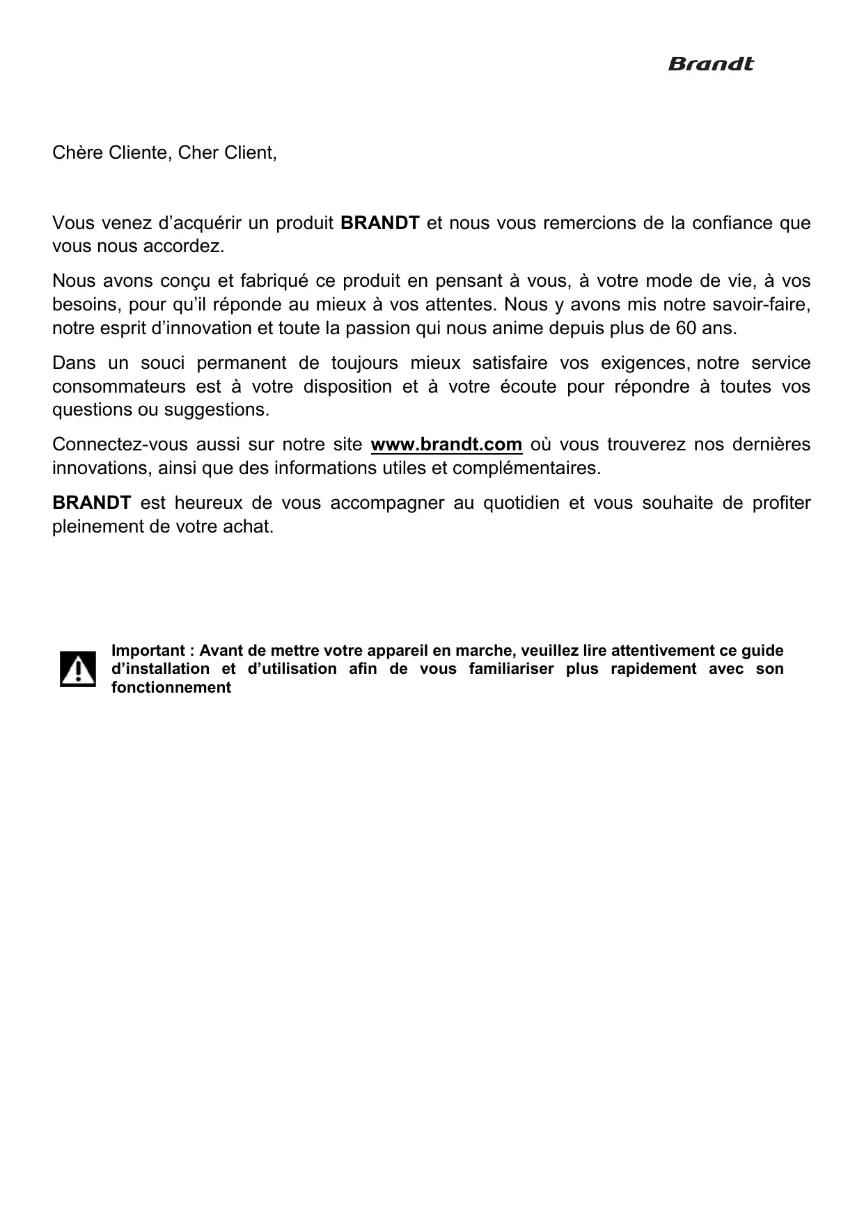 Vous venez d'acquérir un produit BRANDT et nous vous remercions de la confiance que vous nous accordez.