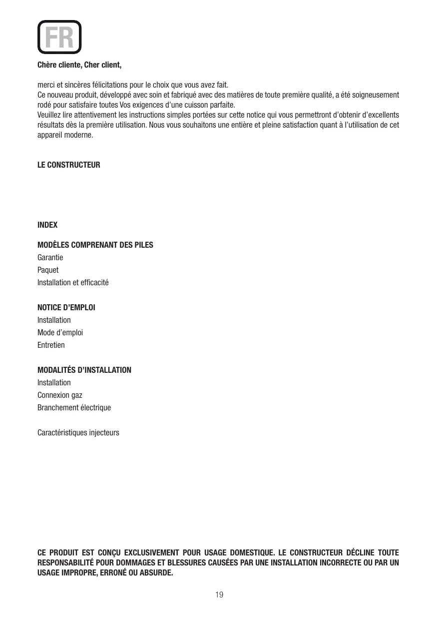 Le fabricant de la plaque de cuisson à gaz dégage toute responsabilité en cas de défaillance des piles.