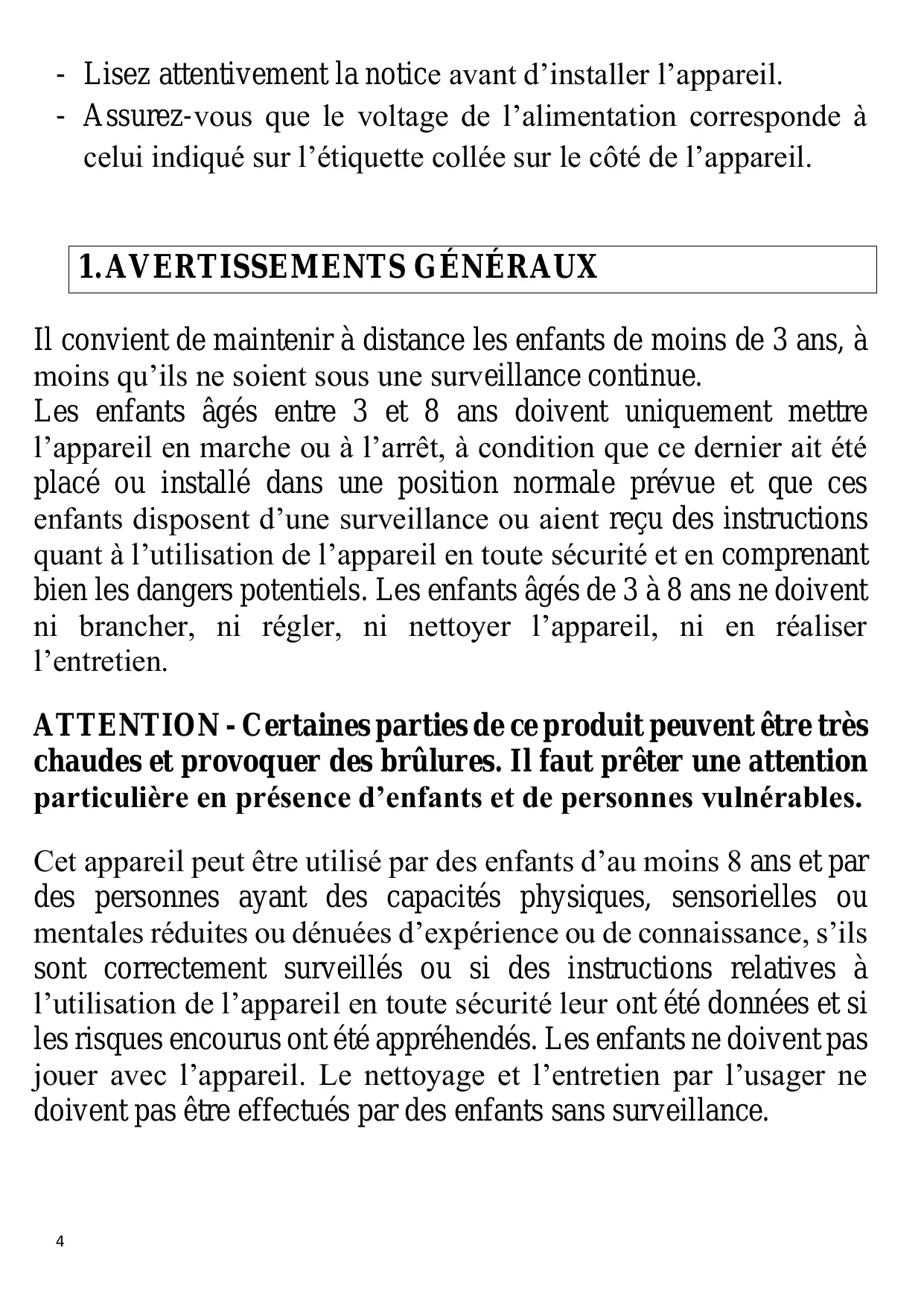 Il convient de maintenir à distance les enfants de moins de 3 ans, à moins qu’ils ne soient sous une surveillance continue. Les enfants âgés entre 3 et 8 ans doivent uniquement mettre l’appareil en marche ou à l’arrêt, à condition que ce dernier ait été placé ou installé dans une position normale prévue et que ces enfants disposent d’une surveillance ou aient reçu des instructions quant à l’utilisation de l’appareil en toute sécurité et en comprenant bien les dangers potentiels. Les enfants âgés de 3 à 8 ans ne doivent ni brancher, ni régler, ni nettoyer l’appareil, ni en réaliser l’entretien. ATTENTION - Certaines parties de ce produit peuvent être très chaudes et provoquer des brûlures. Il faut prêter une attention particulière en présence d’enfants et de personnes vulnérables. Cet appareil peut être utilisé par des enfants d’au moins 8 ans et par des personnes ayant des capacités physiques, sensorielles ou mentales réduites ou dénuées d’expérience ou de connaissance, s’ils sont correctement surveillés ou si des instructions relatives à l’utilisation de l’appareil en toute sécurité leur ont été données et si les risques encourus ont été appréhendés. Les enfants ne doivent pas Jouer avec l’appareil. Le nettoyage et l’entretien par l’usager ne doivent pas être effectués par des enfants sans surveillance.