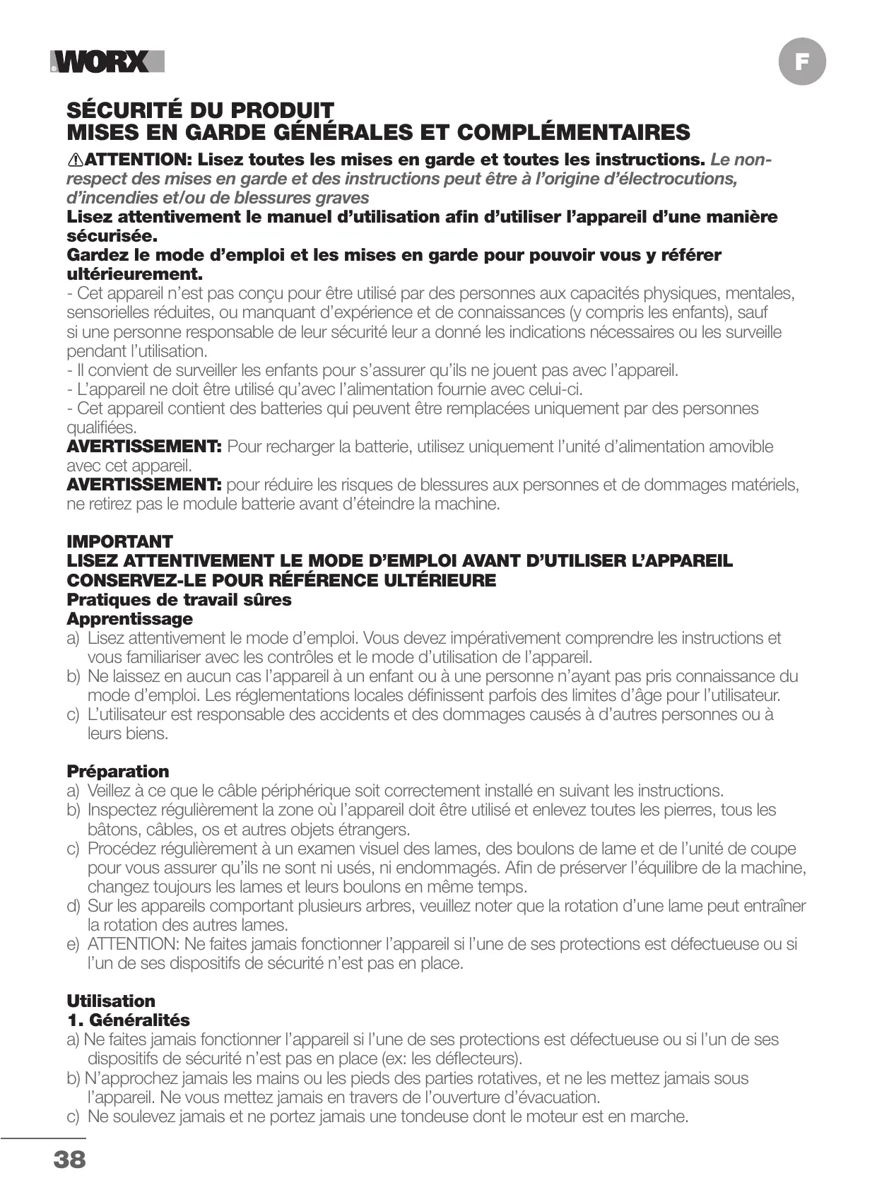 h) Ne laissez en aucun cas la tondeuse à une personne non familiarisée avec l'appareil et son mode d'utilisation.