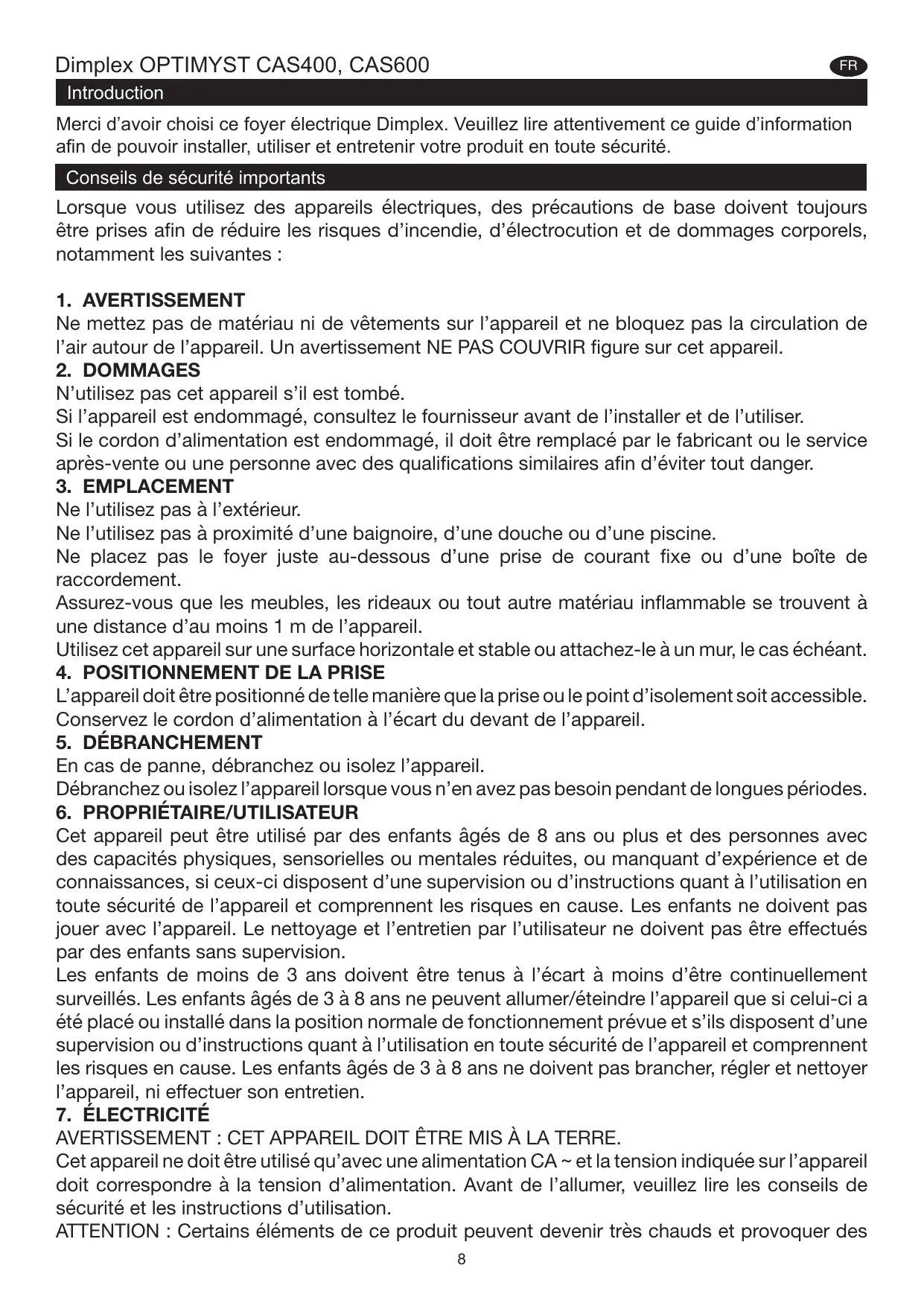 été placé ou installé dans la position normale de fonctionnement prévue et s'ils disposent d’une supervision ou d'instructions quant à l’utilisation en toute sécurité de l’appareil et comprennent les risques en cause. Les enfants âgés de 3 à 8 ans ne doivent pas brancher, régler et nettoyer l'appareil, ni effectuer son entretien.