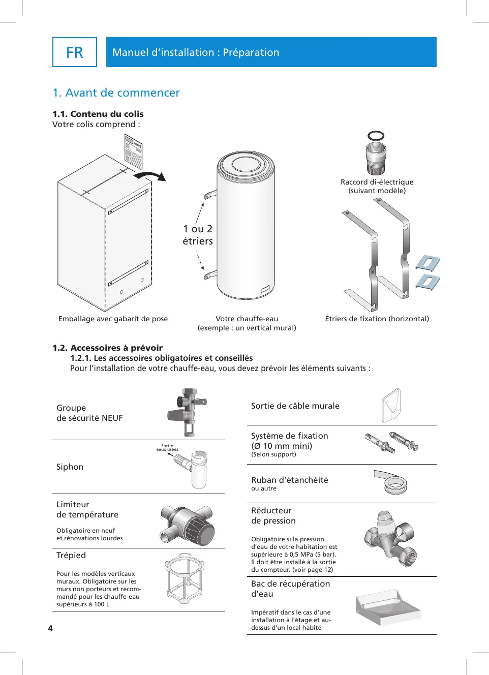 Le groupe de sécurité 15 Vidange d'un chauffe-eau 1.2.1. Les accessoires obligatoires et conseillés Pour l'installation de votre chauffe-eau, vous devez prévoir les éléments suivants :