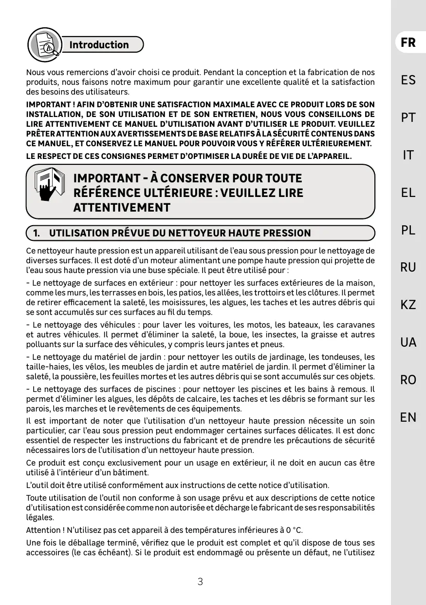 FN IMPORTANT - À CONSERVER POUR TOUTE REFERENCE ULTÉRIEURE : VEUILLEZ LIRE ATTENTIVEMENT Qi. UTILISATION PRÉVUE DU NETTOYEUR HAUTE PRESSION )