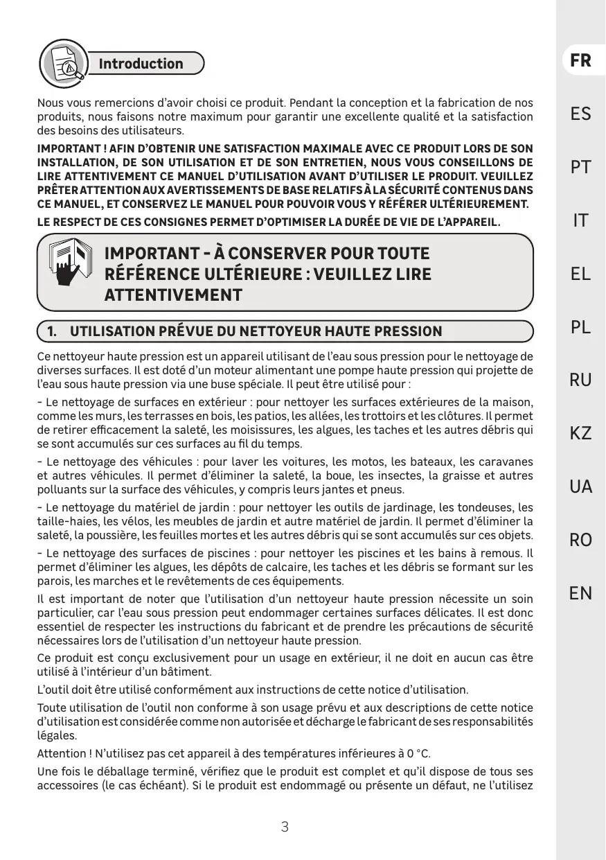FN IMPORTANT - À CONSERVER POUR TOUTE REFERENCE ULTÉRIEURE : VEUILLEZ LIRE ATTENTIVEMENT QG. UTILISATION PRÉVUE DU NETTOYEUR HAUTE PRESSION )