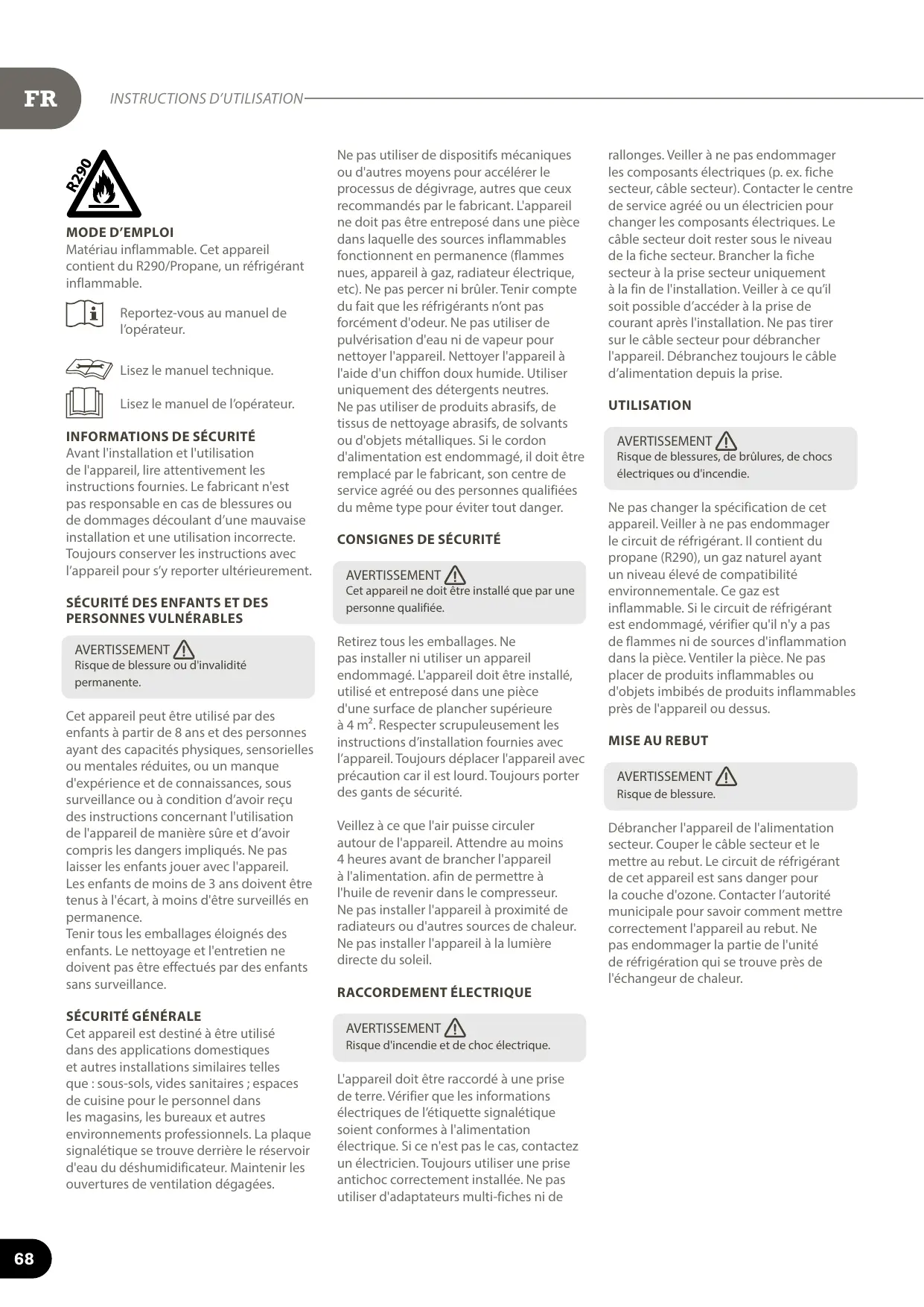 MODE D'EMPLOI Matériau inflammable. Cet appareil contient du R290/Propane, un réfrigérant inflammable.