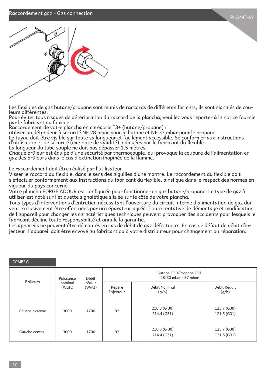 PLANCHA Les flexibles de gaz butane/propane sont munis de raccords de différents formats, ils sont signalés de cou- leurs différentes. Pour éviter tous risques de détérioration du raccord de la plancha, veuillez vous reporter à la notice fournie ar le fabricant du flexible. accordement de votre plancha en catégorie 13+ (butane/propane) : utiliser un détendeur à sécurité NF 28 mbar pour le butane et NF 37 mbar pour le propane. Le tuyau doit être visible sur toute sa longueur et facilement accessible. Se conformer aux instructions d'utilisation et de sécurité (ex : date de validité) indiquées par le fabricant du flexible. La longueur du tube souple ne doit pas dépasser 1.5 mètres. Chaque brûleur est équipé d'une sécurité par thermocouple, qui provoque la coupure de l'alimentation en gaz des brûleurs dans le cas d'extinction inopinée de la flamme.