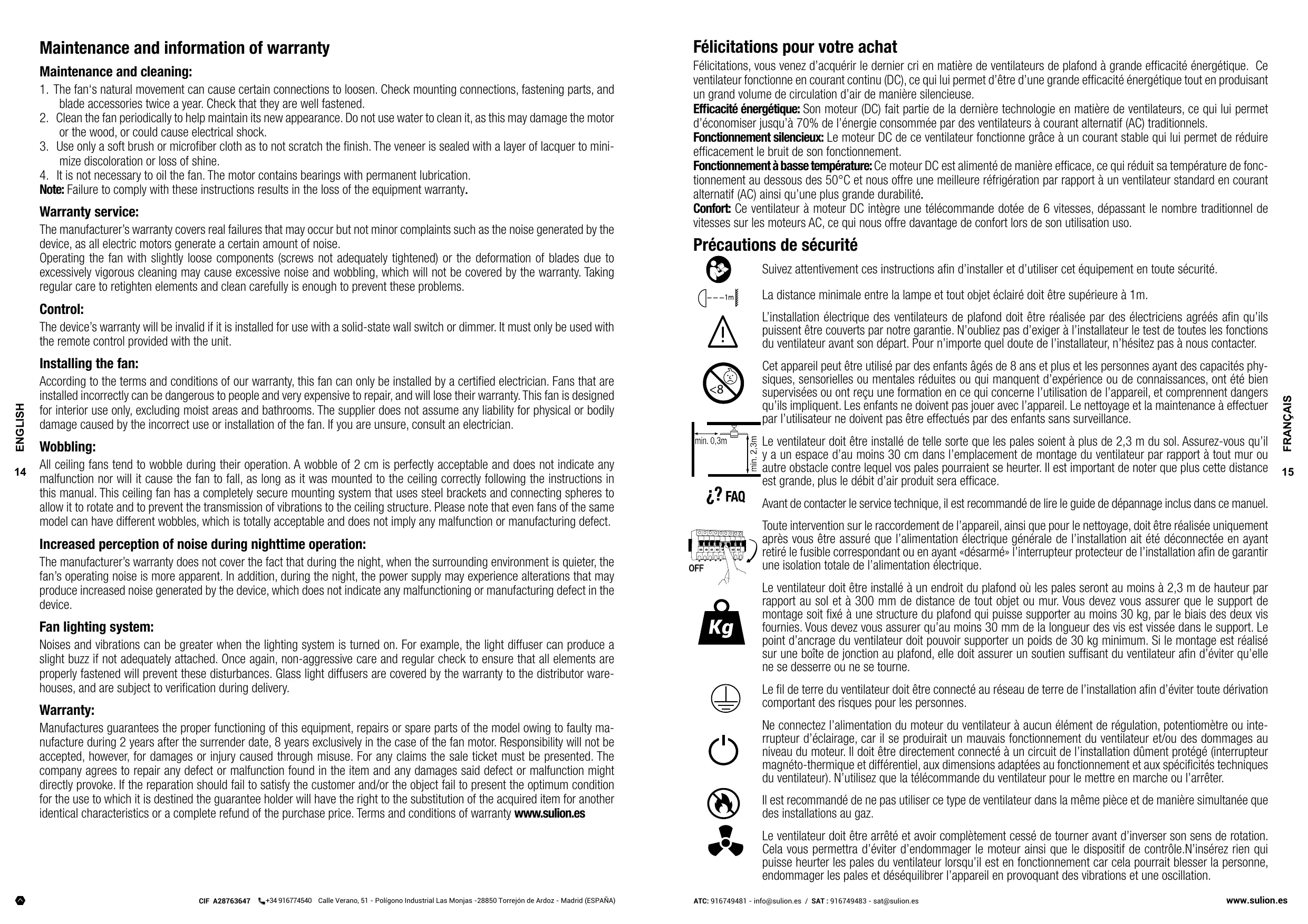 Le fabricant garantit le bon fonctionnement de l'appareil et les possibles réparations ou fourniture de pièces de rechange du modèle, à cause des défauts de fabrication, pendant une période de 2 ans à compter de la date de la livraison, 8 ans exclusivement dans le cas du moteur du ventilateur. Mais il n'assume pas la responsabilité des dommages et préjudices causés par un mauvais emploi. En cas de réclamation on devra joindre le ticket d’ achat à la garantie. L'entreprise s'engage à réparer gratuitement et totalement les défauts causés et les dommages et préjudices occasionnnés directement par ceux-ci. De même si la réparation n'est pas satisfaisante et l'objet ne remplit pas les conditions optimales pour l'usage auquel il est destiné, le titulaire de la garantie aura droit à son remplacement par un autre de caractéristiques identiques ou au remboursement du Prix d'achat. Termes et conditions de garantie wwwr.sulion.es