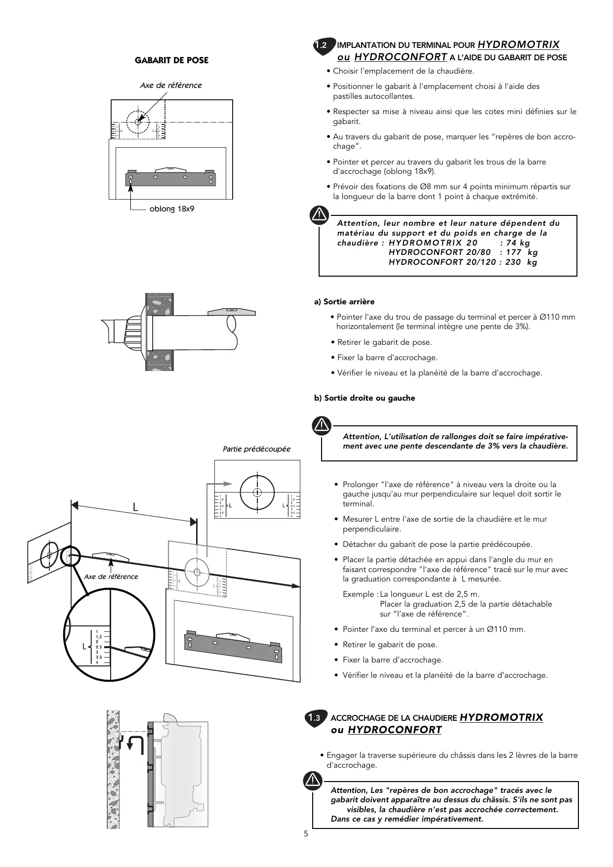 GABARIT DE POSE ou HYDROCONFORT A L'AIDE DU GABARIT DE POSE + Choisir l'emplacement de la chaudière. Axe de référence + Positionner le gabarit à l'emplacement choisi à l'aide des pastilles autocollantes. + Respecter sa mise à niveau ainsi que les cotes mini définies sur le gabarit. + Au travers du gabarit de pose, marquer les ‘repères de bon accro- chage” + Pointer et percer au travers du gabarit les trous de la barre d'accrochage (oblong 18x9) + Prévoir des fixations de G8 mm sur 4 points minimum répartis sur la longueur de la barre dont 1 point à chaque extrémité. 1 oblong 189 © Attention, leur nombre et leur nature dépendent du matériau du support et du poids en charge de la chaudière : HYDROMOTRIX 20 :74 kg HYDROCONFORT 20/80 :177 kg HYDROCONFORT 20/120 : 230 kg a) Sortie arrière + Pointer l'axe du trou de passage du terminal et percer à 2110 mm horizontalement (le terminal intègre une pente de 3%). + Retirer le gabarit de pose. + Fixer la barre d'accrochage. + Vérifier le niveau et la planéité de la barre d'accrochage. b) Sortie droite ou gauche