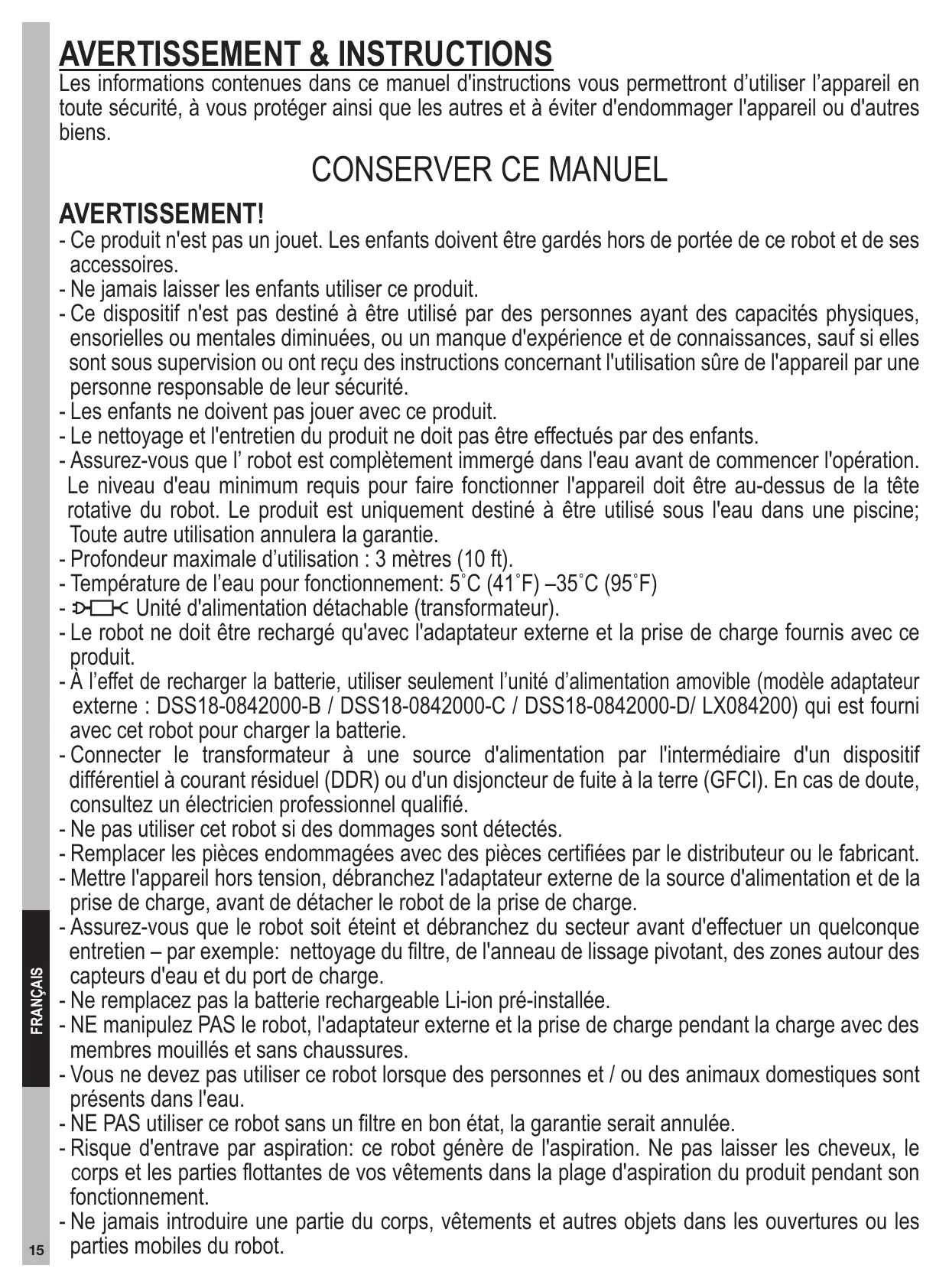 - Ce robot est conçu pour une utilisation sous l'eau uniquement; ce n'est pas un aspirateur tout usage. NE PAS essayer d'utiliser l'aspirateur électrique pour nettoyer autre chose que votre piscine.