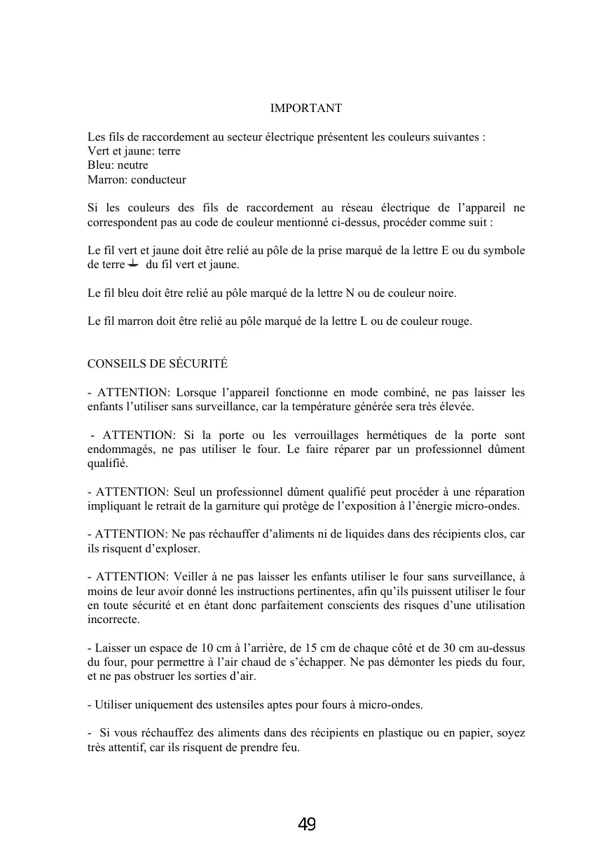 - ATTENTION: Lorsque l'appareil fonctionne en mode combiné, ne pas laisser les enfants l’utiliser sans surveillance, car la température générée sera très élevée. - ATTENTION: Si la porte ou les verrouillages hermétiques de la porte sont endommagés, ne pas utiliser le four. Le faire réparer par un professionnel dûment qualifié. - ATTENTION: Seul un professionnel dûment qualifié peut procéder à une réparation impliquant le retrait de la garniture qui protège de l’exposition à l’énergie micro-ondes. - ATTENTION: Ne pas réchauffer d'aliments ni de liquides dans des récipients clos, car ils risquent d’exploser. - ATTENTION: Veiller à ne pas laisser les enfants utiliser le four sans surveillance, à moins de leur avoir donné les instructions pertinentes, afin qu'ils puissent utiliser le four en toute sécurité et en étant donc parfaitement conscients des risques d’une utilisation incorrecte. - Laisser un espace de 10 cm à l'arrière, de 15 cm de chaque côté et de 30 cm au-dessus du four, pour permettre à l'air chaud de s’échapper. Ne pas démonter les pieds du four, et ne pas obstruer les sorties d’air. - Utiliser uniquement des ustensiles aptes pour fours à micro-ondes. = Si vous réchauffez des aliments dans des récipients en plastique ou en papier, soyez très attentif, car ils risquent de prendre feu.