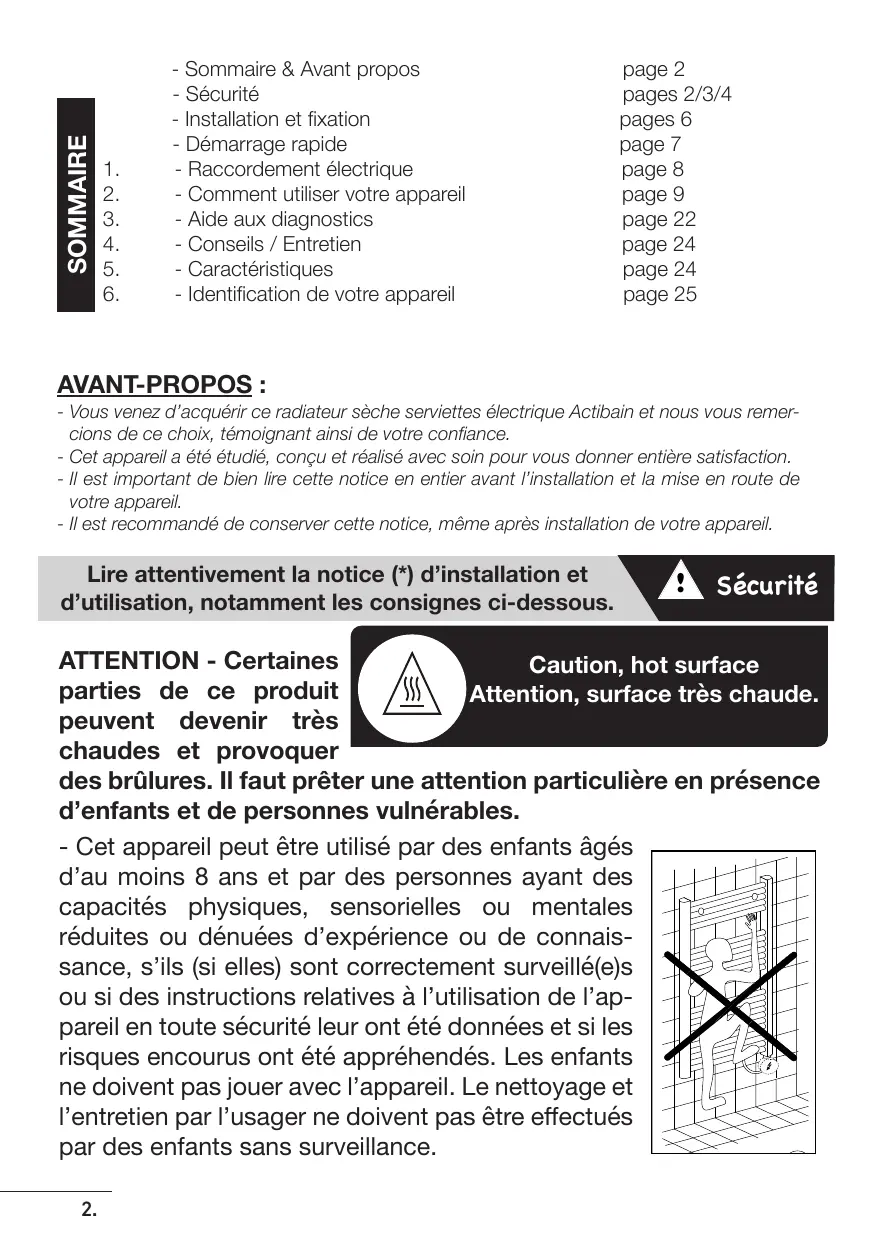 AVANT-PROPOS : - Vous venez d'acquérir ce radiateur sèche serviettes électrique Actibain et nous vous remer- cions de ce choix, témoignant ainsi de votre confiance. - Cet appareil a été étudié, conçu et réalisé avec soin pour vous donner entière satisfaction. - Il est important de bien lire cette notice en entier avant l'installation et la mise en route de votre appareil. - Ilest recommandé de conserver cette notice, même après installation de votre appareil. Lire attentivement la notice (*) d'installation et d'utilisation, notamment les consignes ci-dessous. ATTENTION - Certaines parties de ce produit peuvent devenir très chaudes et provoquer des brûlures. Il faut prêter une attention particulière en présence d’enfants et de personnes vulnérables. Caution, hot surface Attention, surface très chaude. - Cet appareil peut être utilisé par des enfants âgés d’au moins 8 ans et par des personnes ayant des capacités physiques, sensorielles ou mentales réduites ou dénuées d'expérience où de connais- sance, s'ils (si elles) sont correctement surveillé(e)s ou si des instructions relatives à l’utilisation de l’ap- pareil en toute sécurité leur ont été données et si les risques encourus ont été appréhendés. Les enfants ne doivent pas jouer avec l’appareil. Le nettoyage et l'entretien par l’usager ne doivent pas être effectués par des enfants sans surveillance.