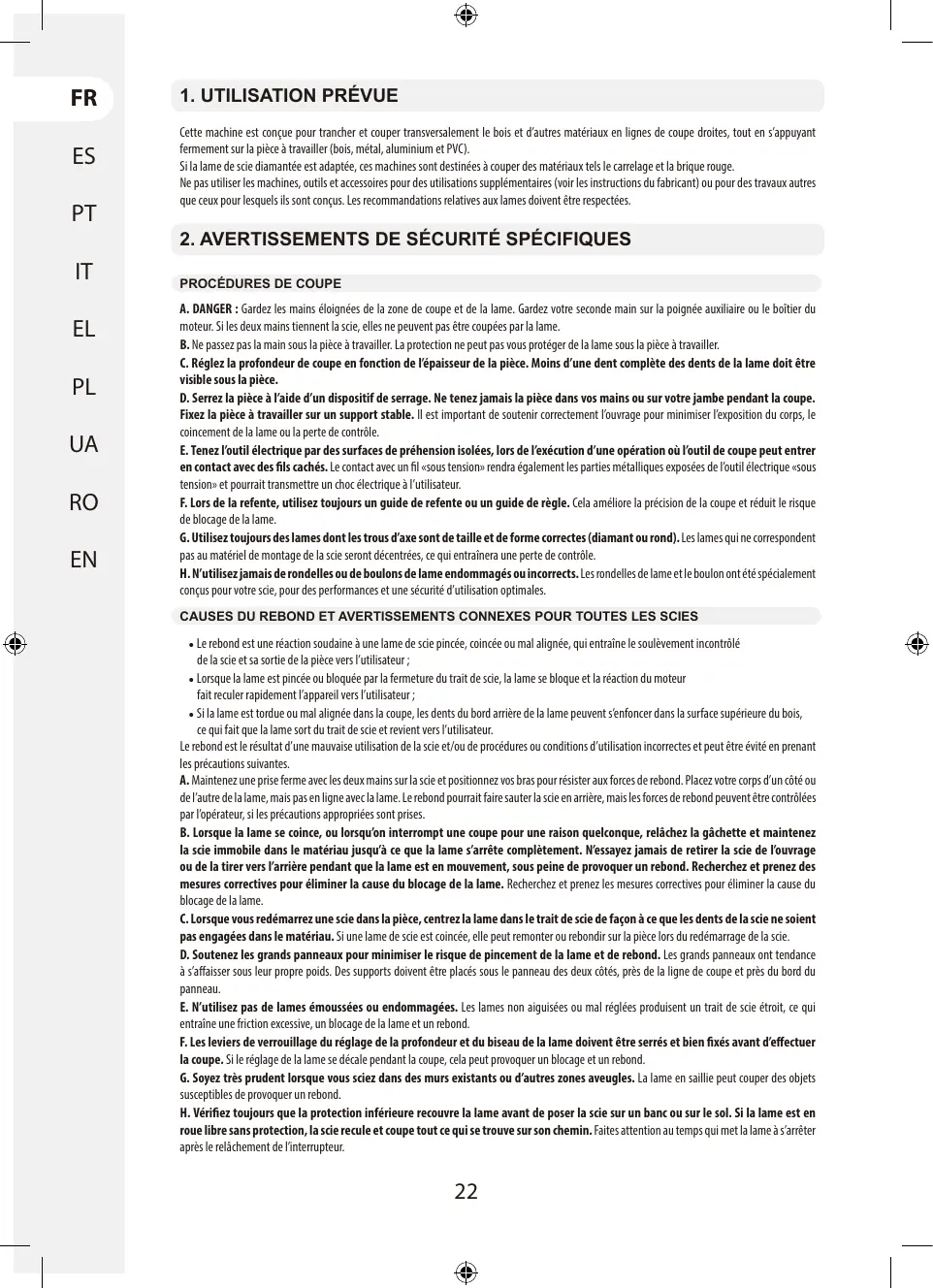 3. AVERTISSEMENTS DE SÉCURITÉ SUPPLÉMENTAIRES AVERTISSEMENTS DE SÉCURITÉ POUR LES MACHINES À TRONÇONNER