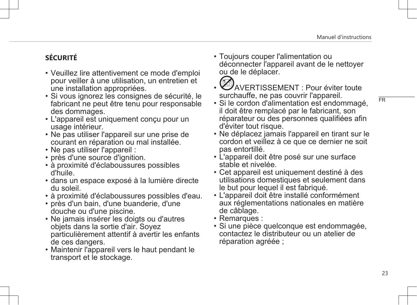 Ne déplacez jamais l'appareil en tirant sur le cordon et veillez à ce que ce dernier ne soit pas entortillé. L'appareil doit être posé sur une surface stable et nivelée. Cet appareil est uniquement destiné à des utilisations domestiques et seulement dans le but pour lequel il est fabriqué. L'appareil doit être installé conformément aux réglementations nationales en matière de câblage. Remarques : Si une pièce quelconque est endommagée, contactez le distributeur ou un atelier de réparation agréée ;
