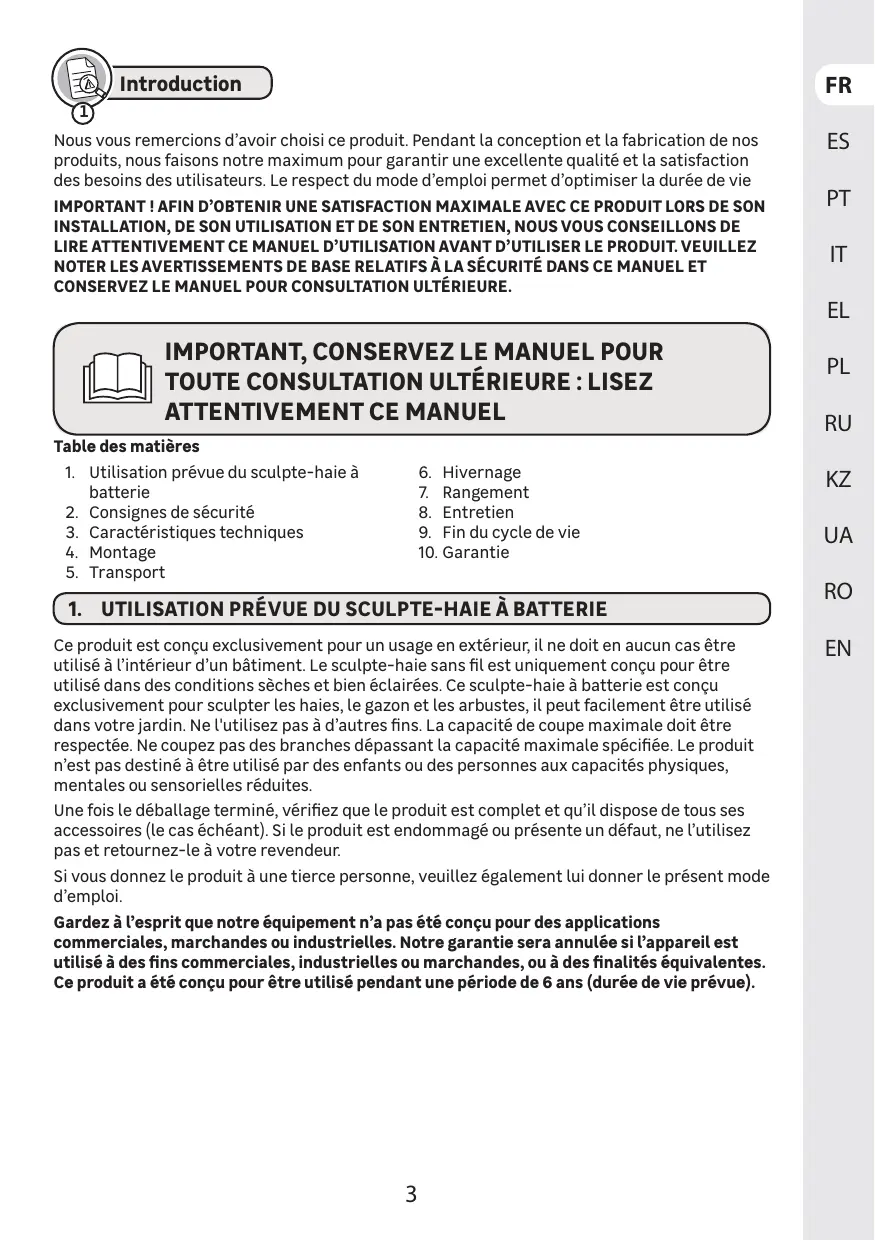-Ne rangez en aucun cas le sculpte-haie avec la batterie déchargée. Rechargez l'appareil dès qu'il est déchargé.