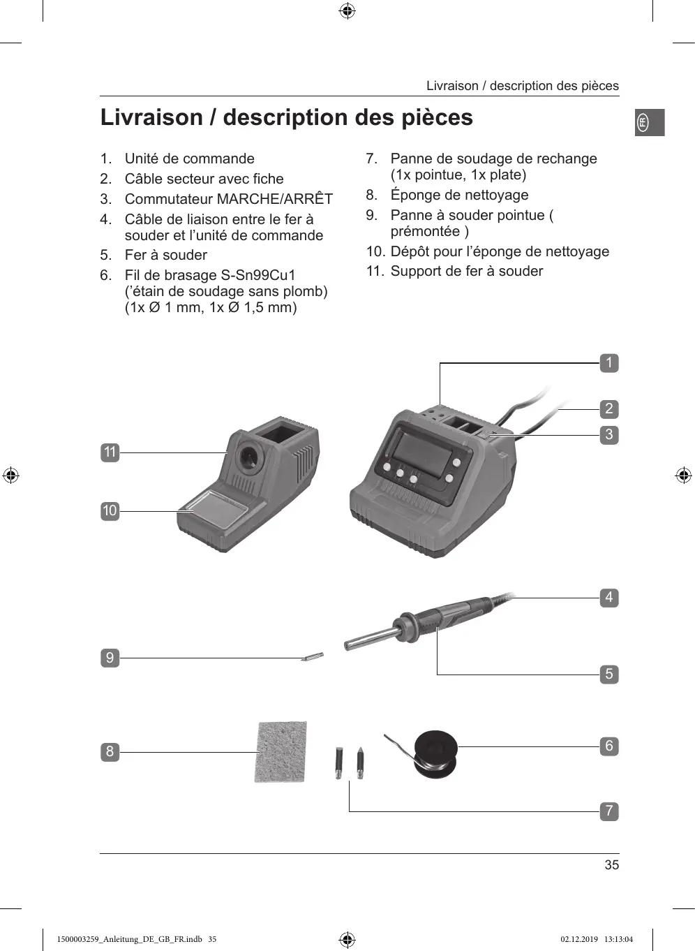 Livraison / description des pièces © | 1. Unité de commande 7. Panne de soudage de rechange 2. Câble secteur avec fiche (1x pointue, 1x plate) 3. Commutateur MARCHE/ARRÊT 8. Eponge de nettoyage 4. Câble de liaison entre le fer à 9. Panne à souder pointue ( souder et l’unité de commande prémontée ) 5. Fer à souder 10. Dépôt pour l'éponge de nettoyage 6. Fil de brasage S-Sn99Cu1 11. Support de fer à souder