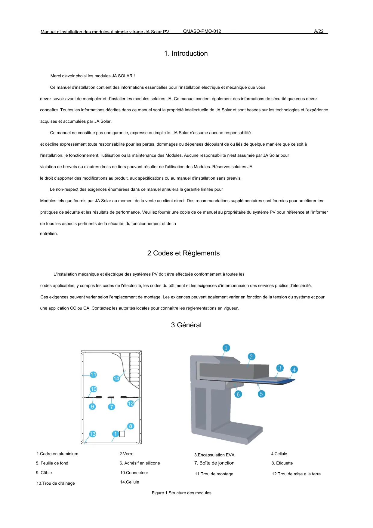 Ce manuel ne constitue pas une garantie, expresse ou implicite. JA Solar n'assume aucune responsabilité et décline expressément toute responsabilité pour les pertes, dommages ou dépenses découler de ou liés de chaque manière que ce soit à l'installation, le fonctionnement, l'utilisation ou la maintenance des Modules. Aucune responsabilité n'est assumée par JA Solar pour violation de brevets ou d'autres droits de tiers pouvant résulter de l'utilisation des Modules. Réserves solaires JA le droit d'apporter des modifications au produit, aux spécifications ou au manuel d'installation sans préavis.