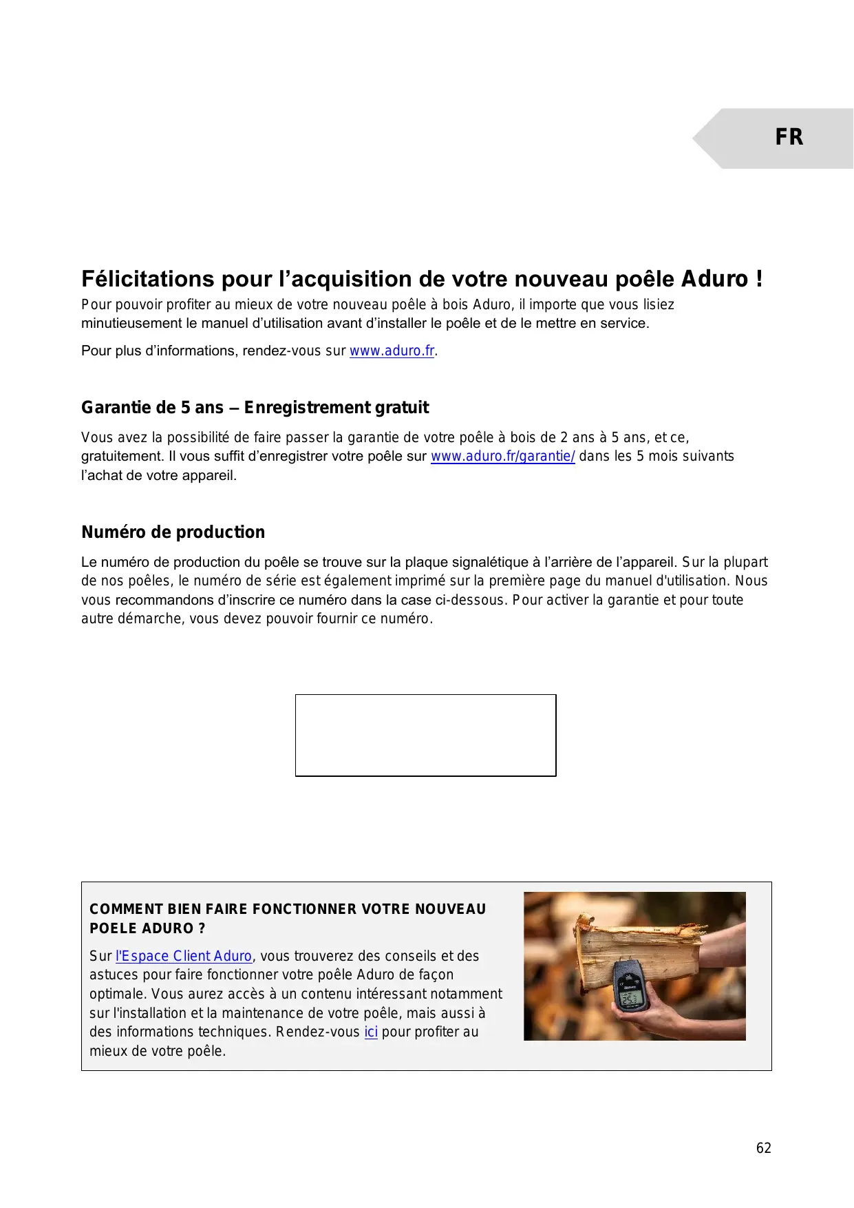 Félicitations pour l’acquisition de votre nouveau poêle Aduro ! Pour pouvoir profiter au mieux de votre nouveau poêle à bois Aduro, il importe que vous lisiez minutieusement le manuel d'utilisation avant d'installer le poêle et de le mettre en service. Pour plus d'informations, rendez-vous sur www.aduro.fr. Garantie de 5 ans -— Enregistrement gratuit Vous avez la possibilité de faire passer la garantie de votre poêle à bois de 2 ans à 5 ans, etce, gratuitement. Il vous suffit d'enregistrer votre poêle sur www.aduro.fr/garantie/ dans les 5 mois suivants l'achat de votre appareil. Numéro de production Le numéro de production du poêle se trouve sur la plaque signalétique à l'arrière de l'appareil. Sur la plupart de nos poêles, le numéro de série est également imprimé sur la première page du manuel d'utilisation. Nous vous recommandons d'inscrire ce numéro dans la case ci-dessous. Pour activer la garantie et pour toute autre démarche, vous devez pouvoir fournir ce numéro.