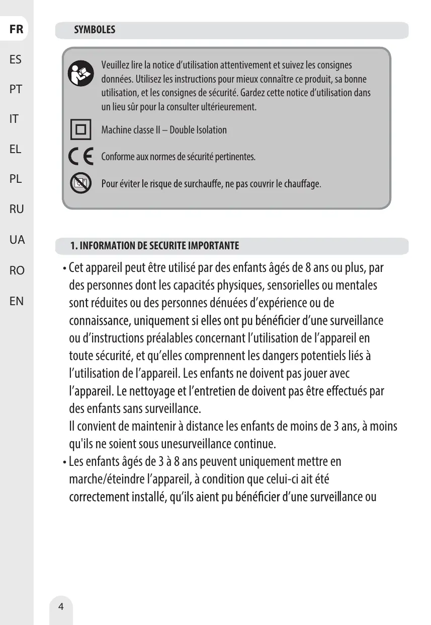 Les enfants âgés de 3 à 8 ans ne doivent pas brancher, régler, nettoyer