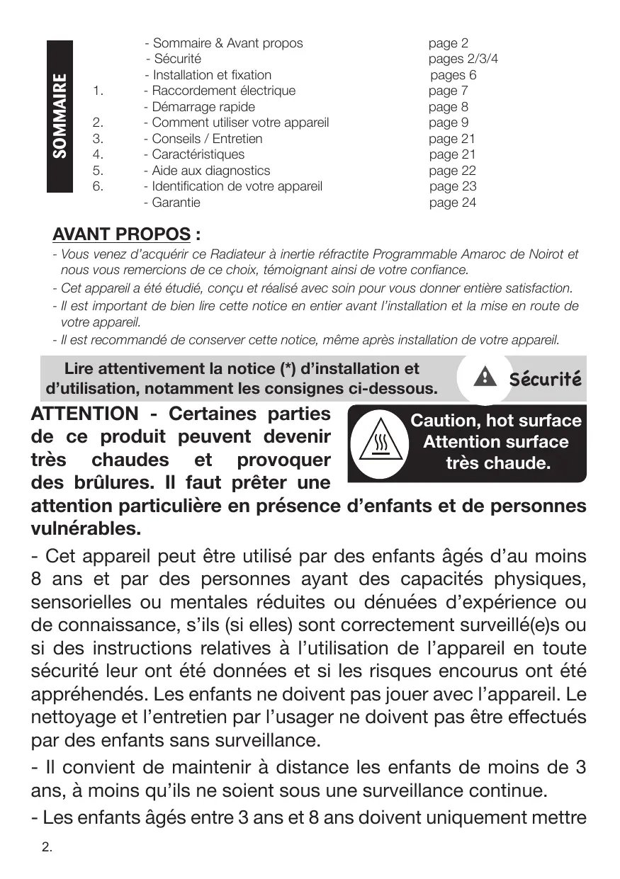 - Garantie page 24 AVANT PROPOS : - Vous venez d'acquérir ce Radiateur à inertie réfractite Programmable Amaroc de Noirot et nous vous remercions de ce choix, témoignant ainsi de votre confiance. - Cet appareil a été étudié, conçu et réalisé avec soin pour vous donner entière satisfaction. - Il est important de bien lire cette notice en entier avant l'installation et la mise en route de votre appareil. - Ilest recommandé de conserver cette notice, même après installation de votre appareil. Lire attentivement la notice (*) d'installation et d'utilisation, notamment les consignes ci-dessous. ATTENTION - Certaines parties Caution, hot surface de ce produit peuvent devenir A Attention surface très chaudes et provoquer des brûlures. Il faut prêter une attention particulière en présence d’enfants et de personnes vulnérables. - Cet appareil peut être utilisé par des enfants âgés d’au moins 8 ans et par des personnes ayant des capacités physiques, sensorielles ou mentales réduites ou dénuées d'expérience ou de connaissance, s’ils (si elles) sont correctement surveillé(e)s ou si des instructions relatives à l’utilisation de l’appareil en toute sécurité leur ont été données et si les risques encourus ont été appréhendés. Les enfants ne doivent pas jouer avec l'appareil. Le nettoyage et l'entretien par l'usager ne doivent pas être effectués par des enfants sans surveillance. - Il convient de maintenir à distance les enfants de moins de 3 ans, à moins qu'ils ne soient sous une surveillance continue. - Les enfants âgés entre 3 ans et 8 ans doivent uniquement mettre