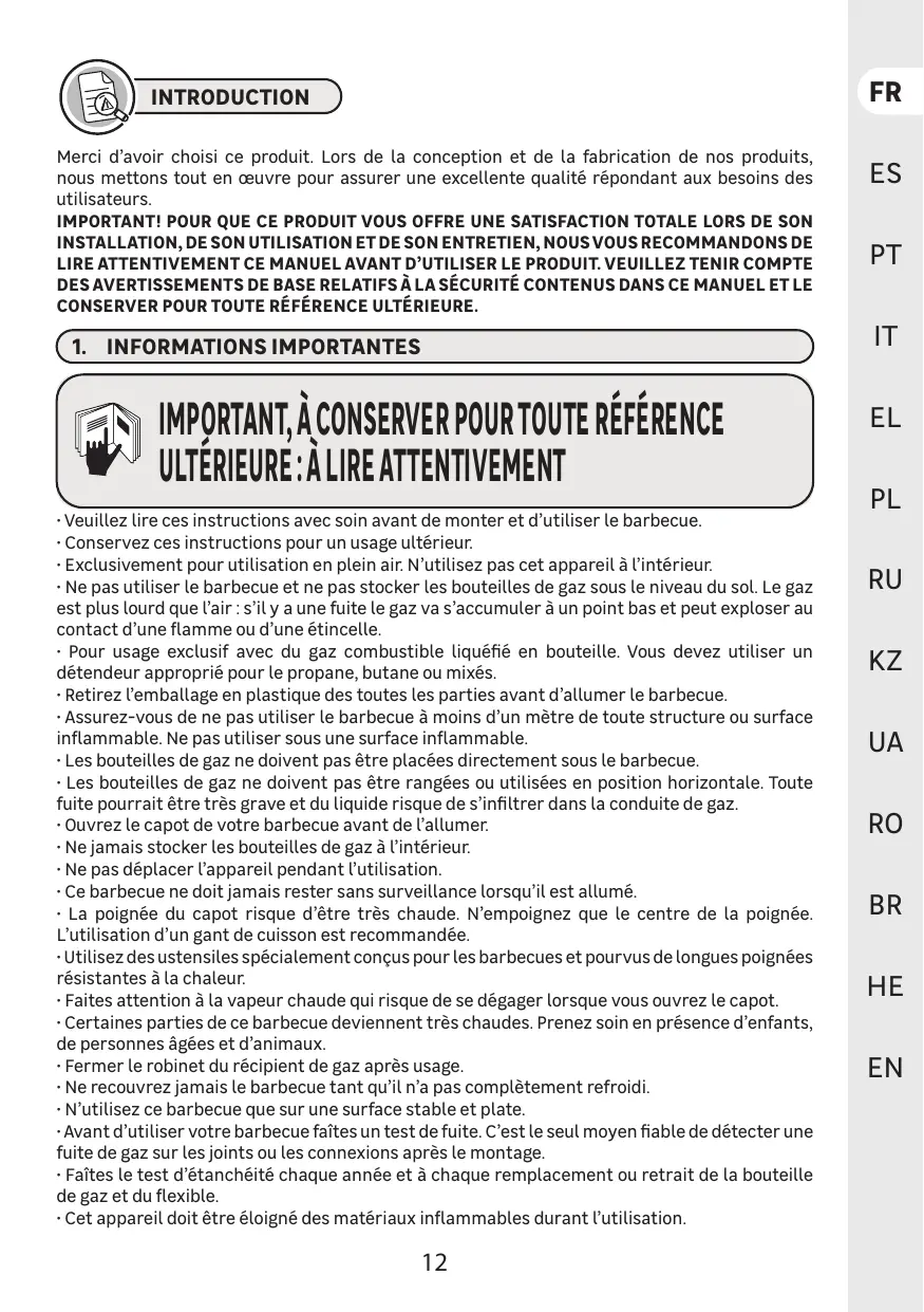 + Ne pas utiliser Le barbecue et ne pas stocker les bouteilles de gaz sous le niveau du sol. Le gaz est plus lourd que l'air : s’il y a une fuite Le gaz va s’accumuler à un point bas et peut exploser au contact d’une flamme ou d’une étincelle.