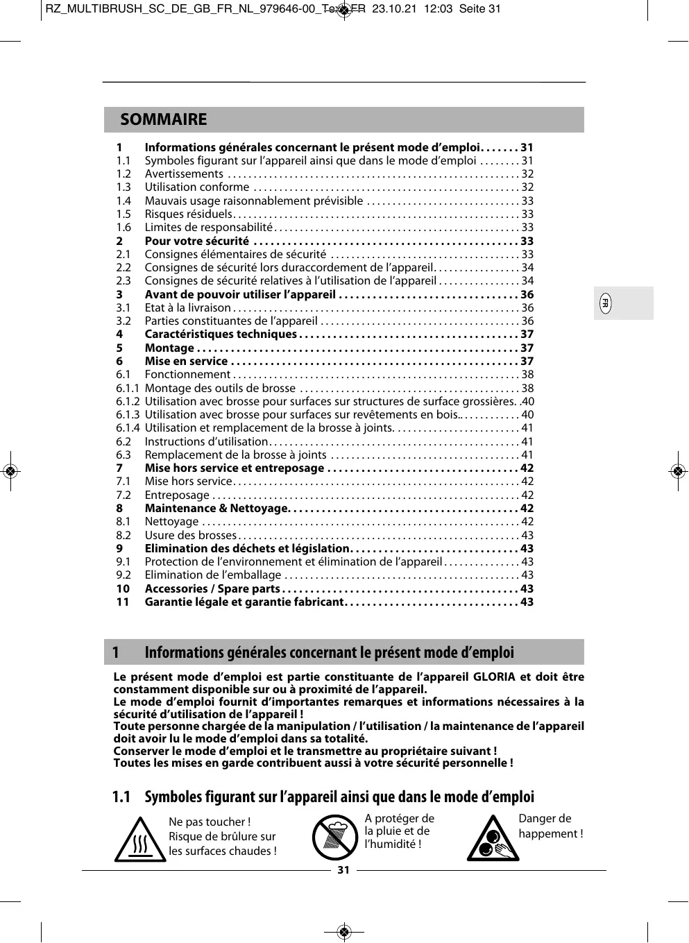 22 Consignes de sécurité lors duraccordement de l'appareil. 23 Consignes de sécurité relatives à l’utilisation de l'appareil 3 Avant de pouvoir utiliser l'appareil . 3.1 Etat à la livraison. 32 Parties constituantes de l' l'appareil : 4 Caractéristiques techniques. 5 Montage 6 Mise en service 6.1.3 Utilisation avec brosse pour surfaces sur revêtements en bois... 6.14 Utilisation et remplacement de la brosse à joints. 62 Instructions d'utilisation. 63 Remplacement de la brosse à joints . 7 Mise hors service et entreposage . 7.1 Mise hors service. . 72 Entreposage... . 8 Maintenance & Nettoyage. 92 Elimination de l'emballage . ES 10 Accessories / Spare parts. . 11. Garantie légale et garantie fabricant