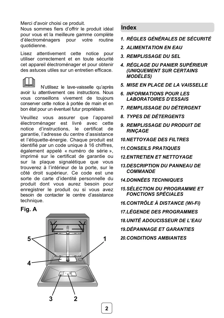 - REMPLISSAGE DU PRODUIT DE RINÇAGE 10. NETTOYAGE DES FILTRES 11. CONSEILS PRACTIQUES 12. ENTRETIEN ET NETTOYAGE 13. DESCRIPTION DU PANNEAU DE COMMANDE 14. DONNÉES TECHNIQUES 15. SÉLECTION DU PROGRAMME ET FONCTIONS SPECIALES 16. CONTROLE A DISTANCE (Wi-Fi) 17. LEGENDE DES PROGRAMMES