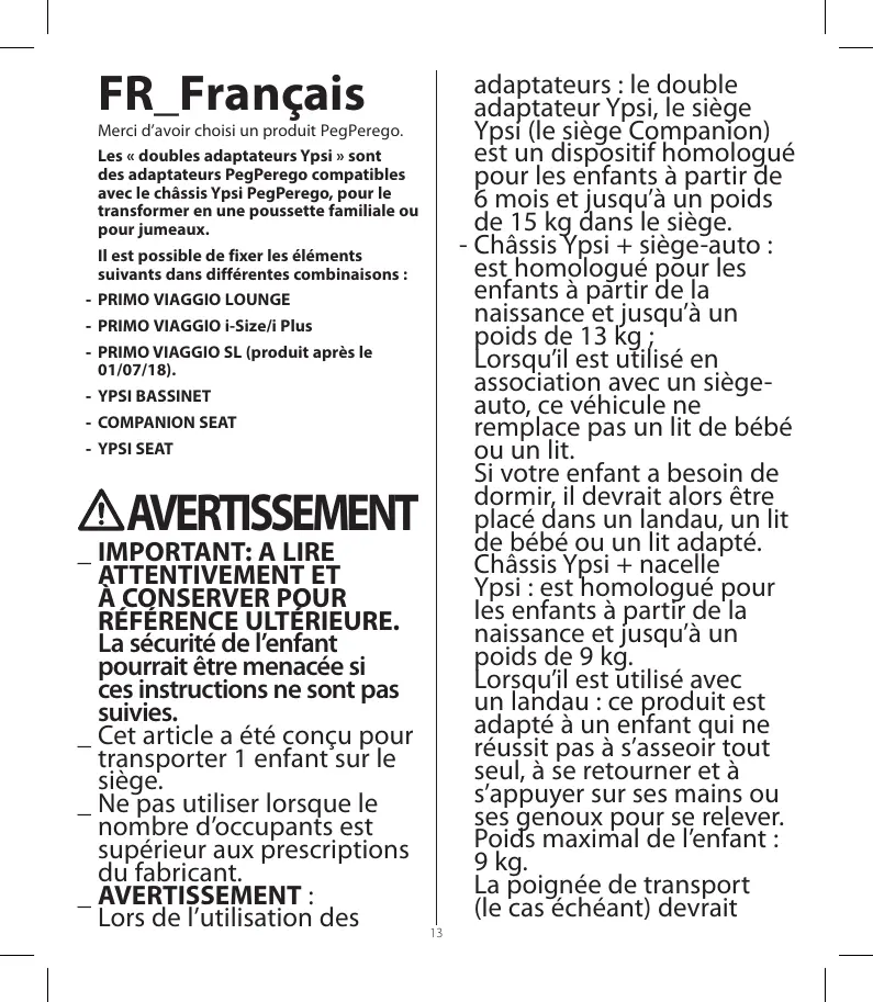 Double adapters Ypsi/Z4 - Poussettes PEG PEREGO - Notice d'utilisation et mode d'emploi gratuit