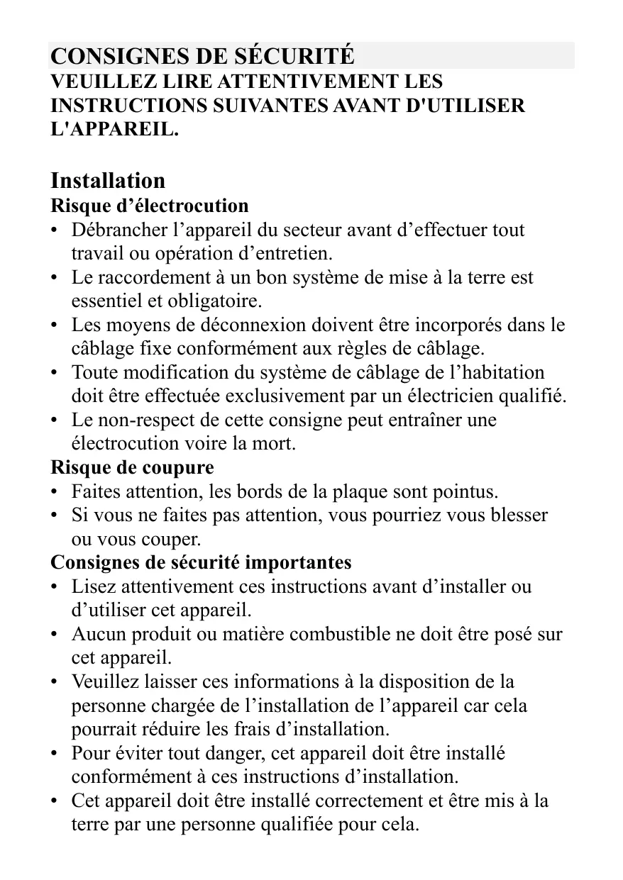 L'utilisateur doit pouvoir accéder aisément au sectionneur quand la plaque de cuisson est installée