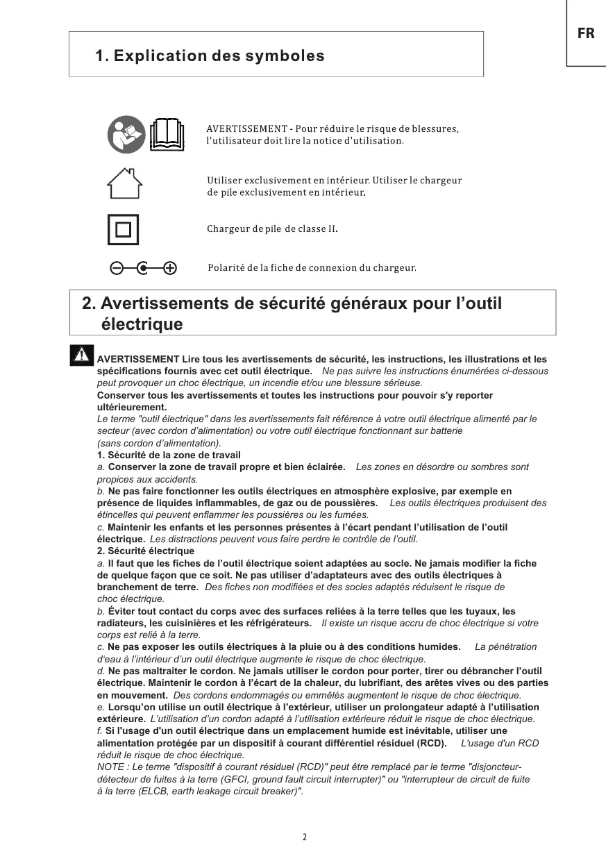 Si l'usage d'un outil électrique dans un emplacement humide est inévitable, utiliser une alimentation protégée par un dispositif à courant différentiel résiduel (RCD). … L'usage d'un RCD réduit le risque de choc électrique.