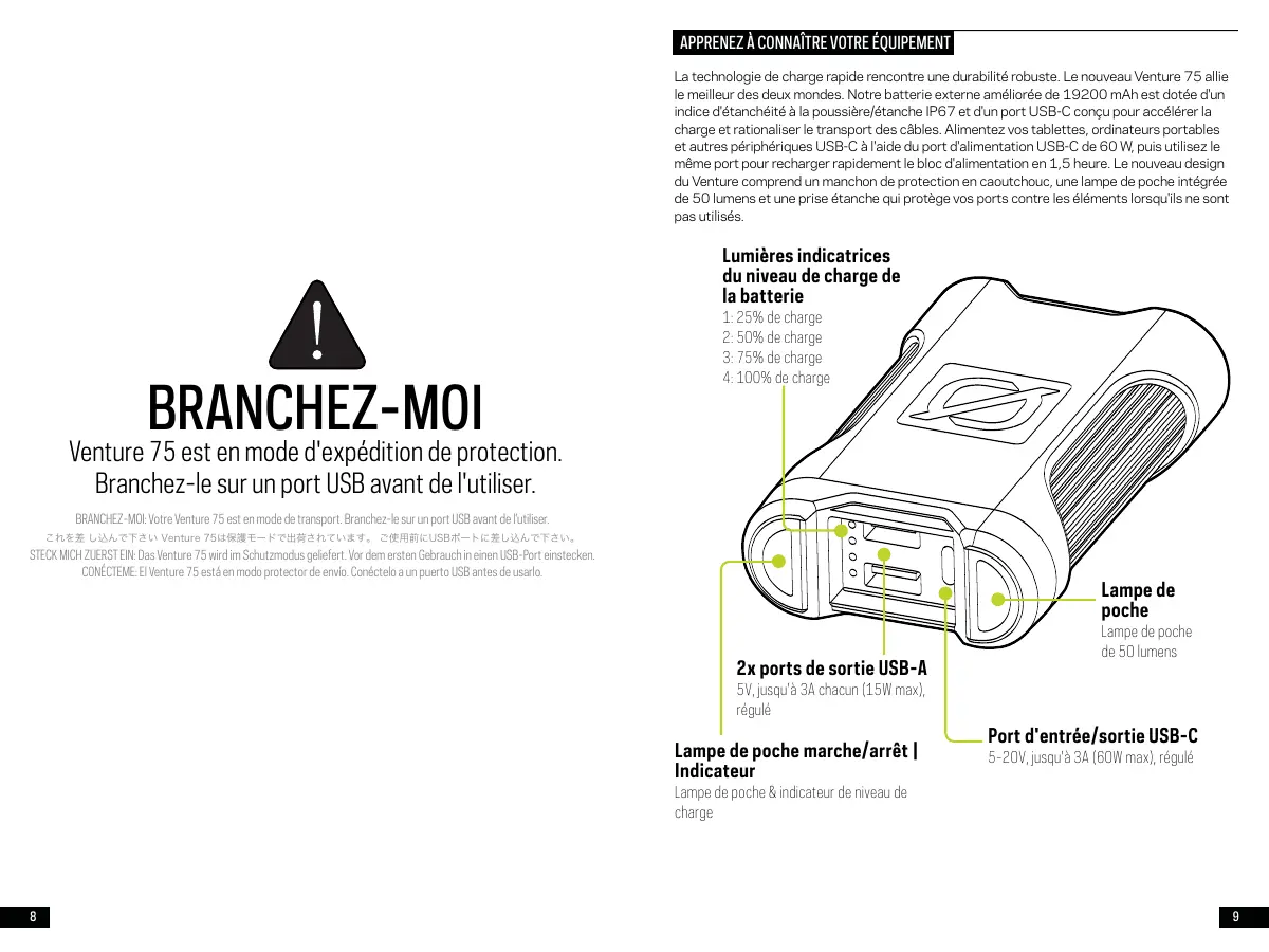MÂAZ2HEURES GATIHEURES GHEURES RECHARGER VOTRE EQUIPEMENT Le Venture 75 est conçu pour charger des téléphones, des tablettes, des caméras POV et d'autres appareil alimentés par USB. Rechargez jusqu'à 3 appareils simultanément.