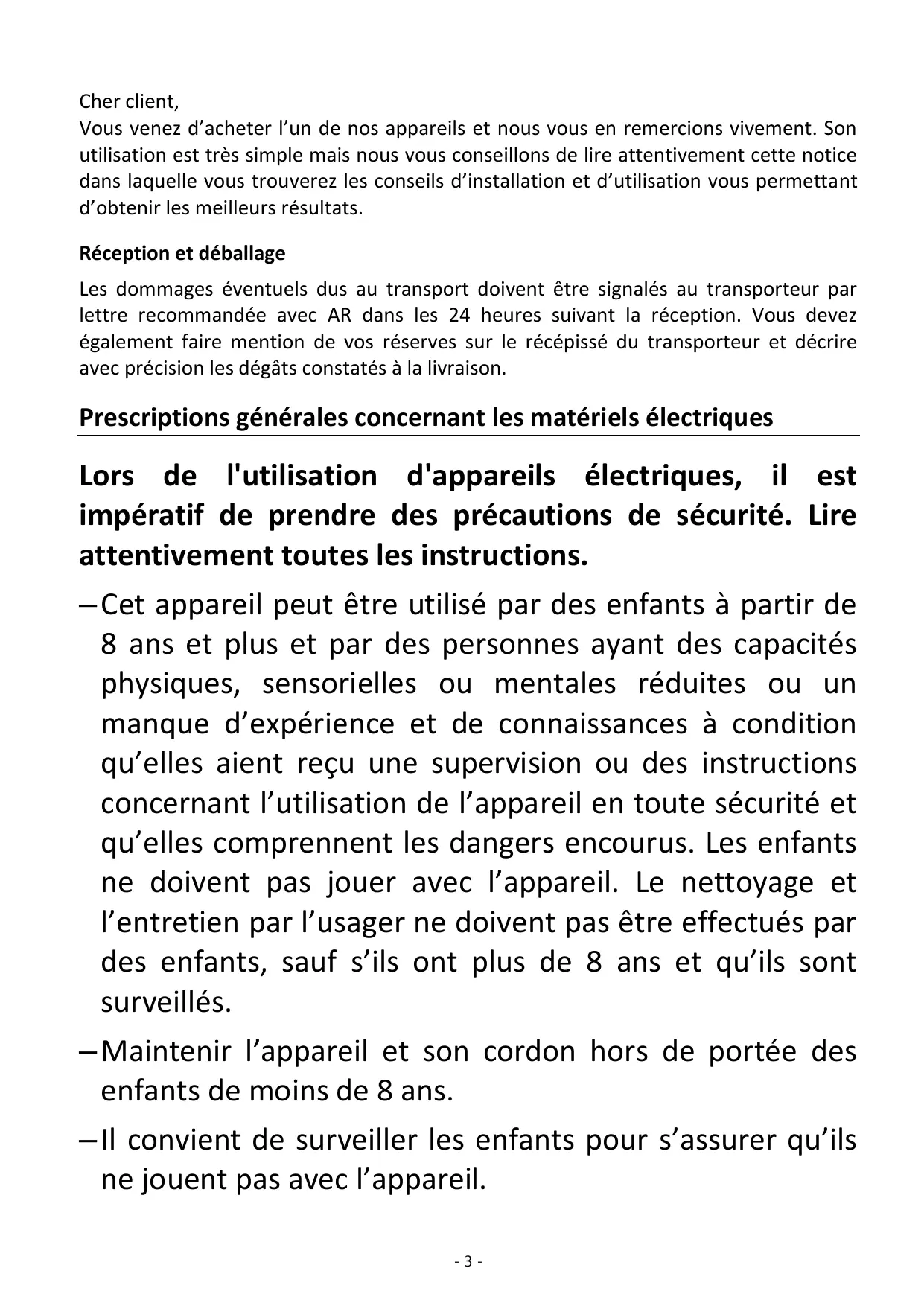 8 ans et plus et par des personnes ayant des capacités physiques, sensorielles ou mentales réduites ou un manque d'expérience et de connaissances à condition qu’elles aient reçu une supervision ou des instructions concernant l’utilisation de l'appareil en toute sécurité et qu’elles comprennent les dangers encourus. Les enfants ne doivent pas jouer avec l’appareil. Le nettoyage et l'entretien par l’usager ne doivent pas être effectués par des enfants, sauf s'ils ont plus de 8 ans et qu’ils sont surveillés.