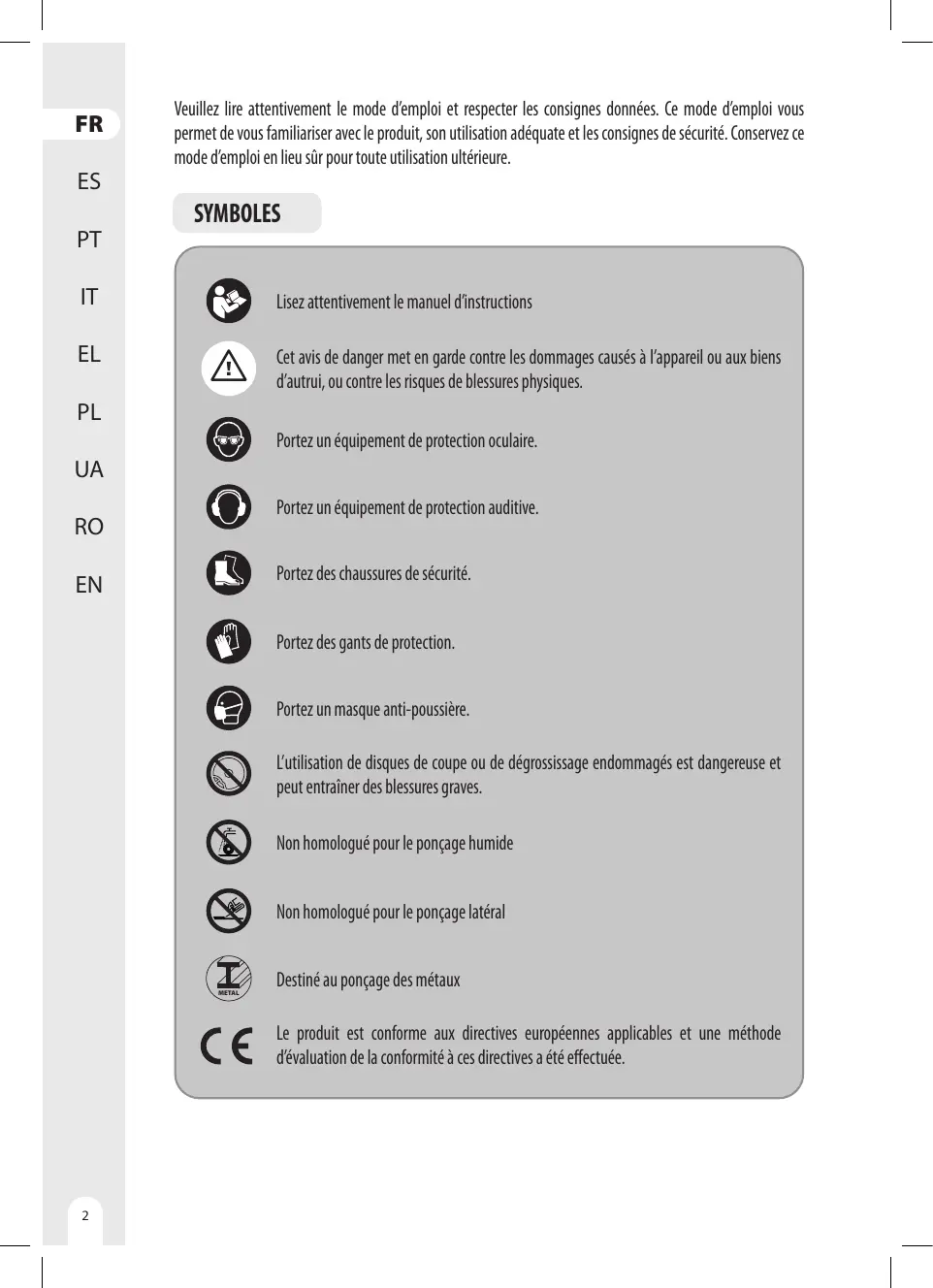 AVERTISSEMENT DE SÉCURITÉ COMMUNS POUR LES OPÉRATIONS DE MEULAGE, DE PONÇAGE, DE BROSSAGE MÉTALLIQUE, ET DE TRONÇONNAGE AÏCET OUTIL ÉLECTRIQUE EST PRÉVU POUR FONCTIONNER COMME MEULEUSE, PONCEUSE, BROSSE MÉTALLIQUE OU TRONÇONNEUSE. LIRE TOUS LES AVERTISSEMENTS DE SÉCURITÉ, INSTRUCTIONS,