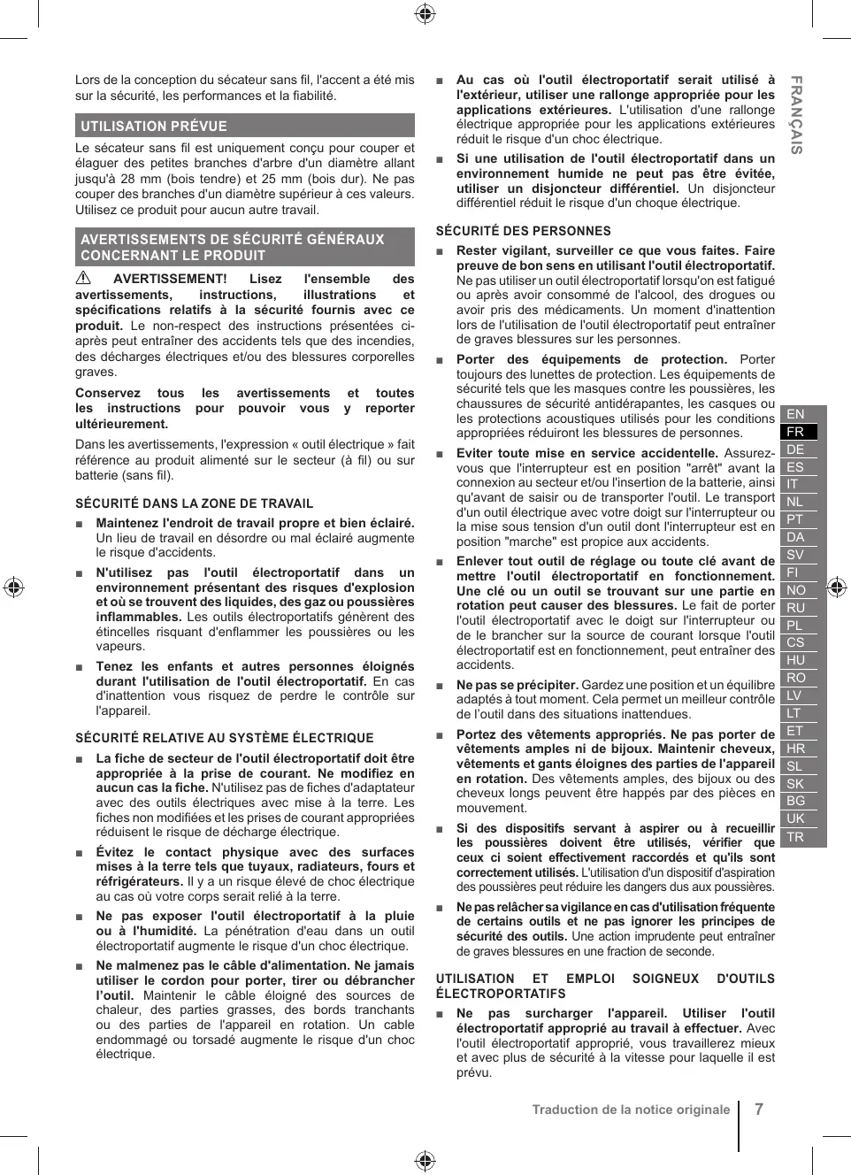 Le sécateur sans fil est uniquement conçu pour couper et élaguer des petites branches d'arbre d'un diamètre allant jusqu'à 28 mm (bois tendre) et 25 mm (bois dur). Ne pas couper des branches d'un diamètre supérieur à ces valeurs. Utilisez ce produit pour aucun autre travail. AVERTISSEMENTS DE SÉCURITÉ GÉNÉRAUX
