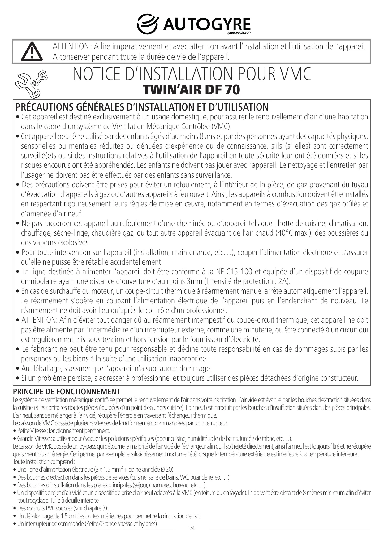 TWIN AIR DF70 - Caisson VMC AUTOGYRE - Notice d'utilisation et mode d'emploi gratuit