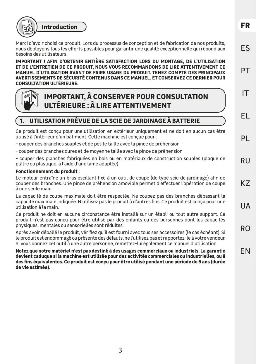 (€ UTILISATION PRÉVUE DE LA SCIE DE JARDINAGE À BATTERIE )