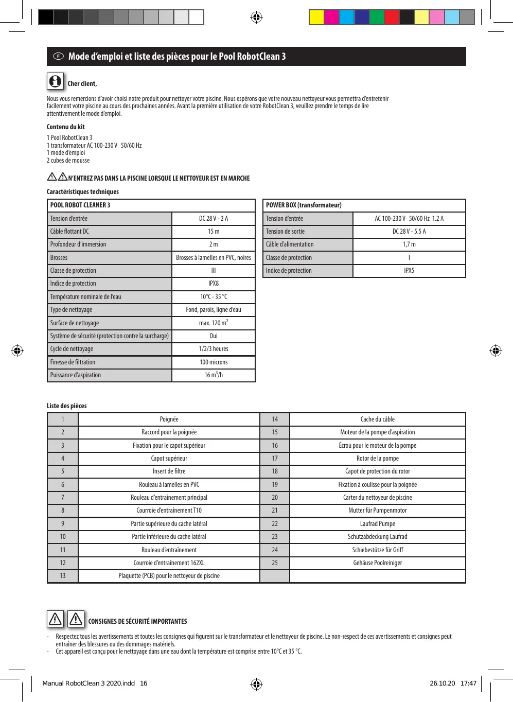 Mode d'emploi et liste des pièces pour le Pool RobotClean 3 Cher dient, Nous vous remercions d'avoir choisi note produit pour nettoyer votre piscine. Nous espérons que votre nouveau nettoyeur vous permettra d'entretenir facilement votre piscine au ours des prochaines années, Avant la première utilisation de votre RobotClean 3, veuilez prendre le temps de ire attentivement le mode d'emploi. Contenu du kit 1 Pool RobotGean 3 1 transformateur AC 100-230V. 50/60 Hz 1 mode d'emploi 2 cubes de mousse Z\ ANWENTREZ PAS DANS LA PISCINE LORSQUE LE NETTOYEUR EST EN MARCHE Caractéristiques techniques POOL ROBOT CLEANER 3 POWER BOX (transformateur) Tension d'entrée DC28V-24 Tension d'entrée AC100-20V 50/60 Hz 124 Gble ittant DC 15m Tension de sortie DC2BV-55A Profondeur d'immersion 2m Gble d'alimentation 17m Brosses Brosses à lamelles en PVC, noires | | Classe de protection [ Classe de protection Il Indice de protection IPS Indice de protection PE Température nominale de l'eau 10-35 °C Type de nettoyage Fond parois ligne d'eau Surface de nettoyage max. 120m* Système de sécurité (protection conte la surcharge) Ou Gyde de nettoyage 12/3 heures Finesse de filtration 100 microns Puissance d'aspiration 16m Liste des pièces 1 Poignée ll Cache du cible 2 Raccord pour poignée 15 Moteur de a pompe d'aspiration 3 Fixation pour le capot supérieur 16 Écrou pour le moteur dela pompe 4 pot supérieur ü Rotor de la pompe 5 Insert de ire ü Capot de protection du rotor 6 Rouleau à lamelles en PVC ü Fixation à coulisse pour la poignée 7 Rouleau d'entrainement principal 2 Carter du nettoyeur de piscine 8 Courroie d'entrainement T10 a Mutter für Pumpenmotor 9 Partie supérieure du cache latéral 2 Laufrad Pumpe 10 Pari inférieure du cache latéral 3 Schutzabdeckung Laufrad ü Rouleau d'entrainement 4 Schiebestite für Gr ü Courroie d'entrainement 1624L 3 Gehäuse Pooleiniger E Plaquette (PCB} pour le nettoyeur de piscine