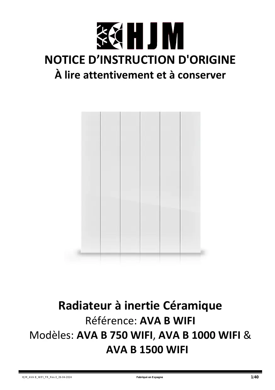 À lire attentivement et à conserver Radiateur à inertie Céramique Référence: AVA B WIFI Modèles: AVA B 750 WIFI, AVA B 1000 WIFI &