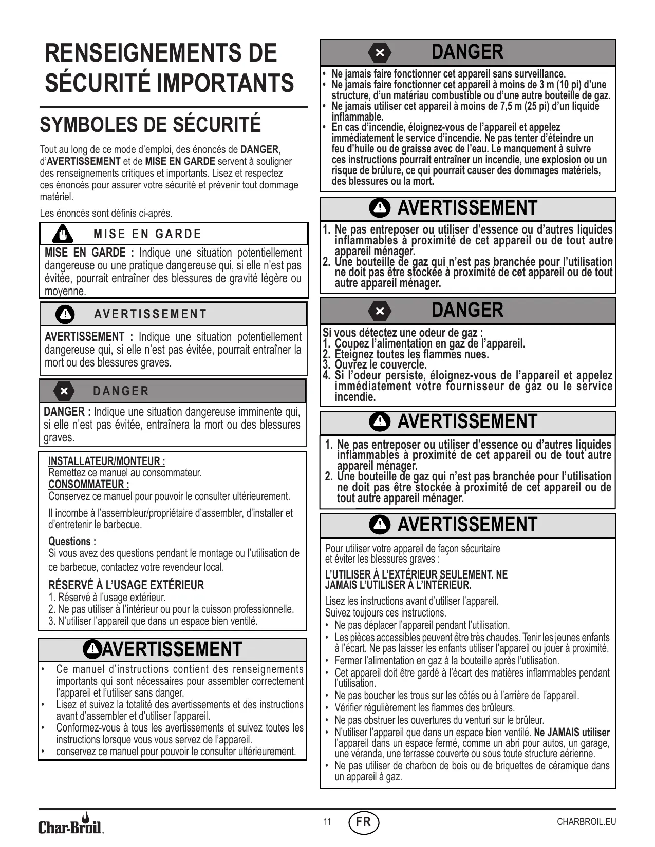 Char-Broil n'est pas responsable des pertes imprévues (c'est-à-dire les pertes ou les dommages que ni vous, ni Char-Broil, ni le vendeur n'avez envisagés au moment de l'achat) ou de tout dommage dont vous êtes la cause, à ceci près que la responsabilité de Char-Broil pour fraude, décès ou dommage corporel causés par sa négligence n'est pas limitée.