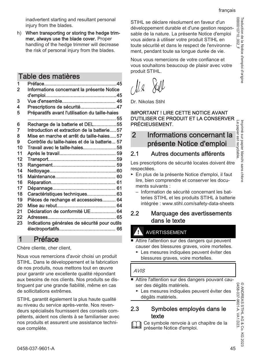 STIHL se déclare résolument en faveur d'un développement durable et d'une gestion respon- sable de la nature. La présente Notice d'emploi vous aidera à utiliser votre produit STIHL en toute sécurité et dans le respect de l'environne- ment, pendant toute sa longue durée de vie