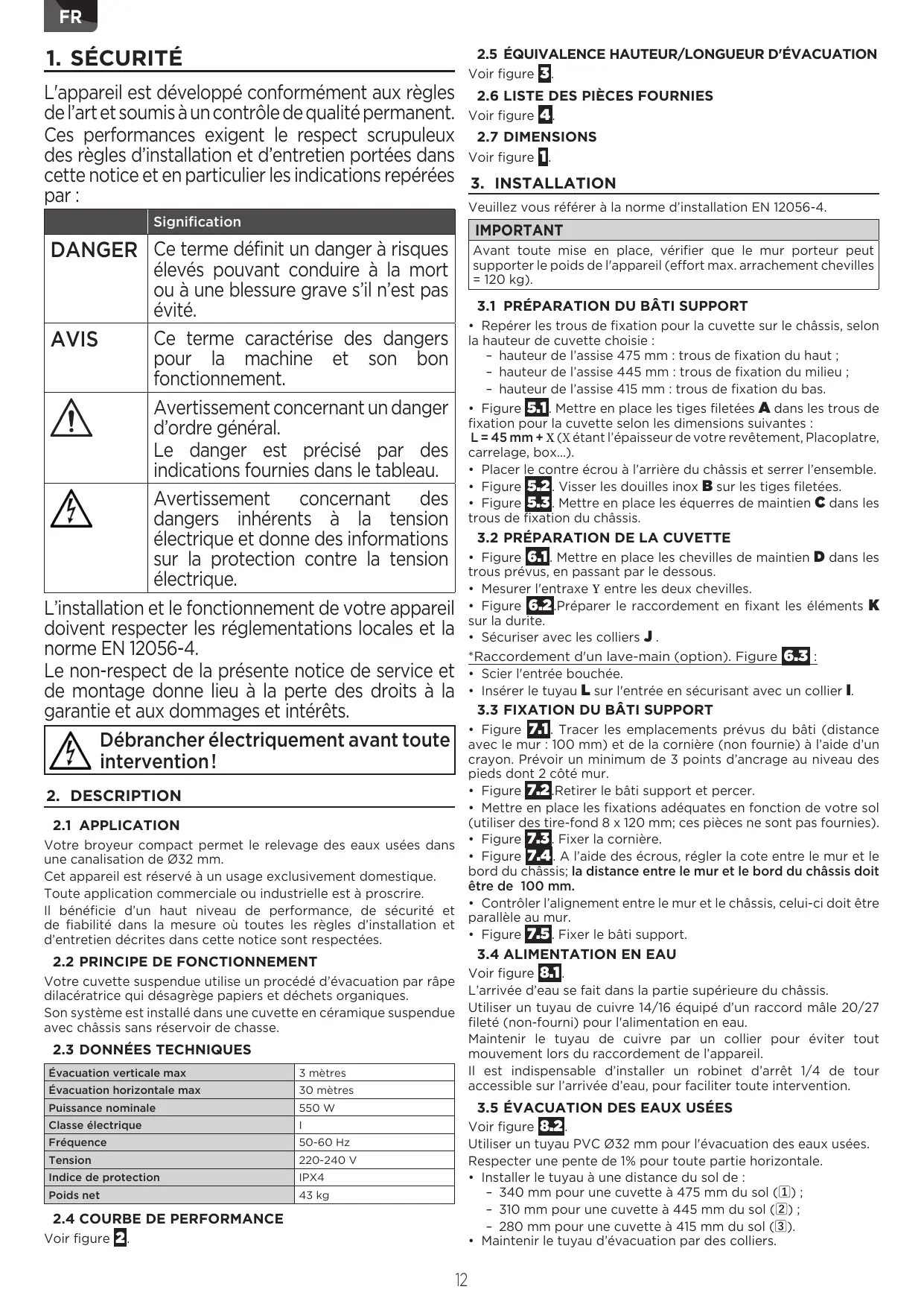 L'installation et le fonctionnement de votre appareil doivent respecter les réglementations locales et la norme EN 12056-4.