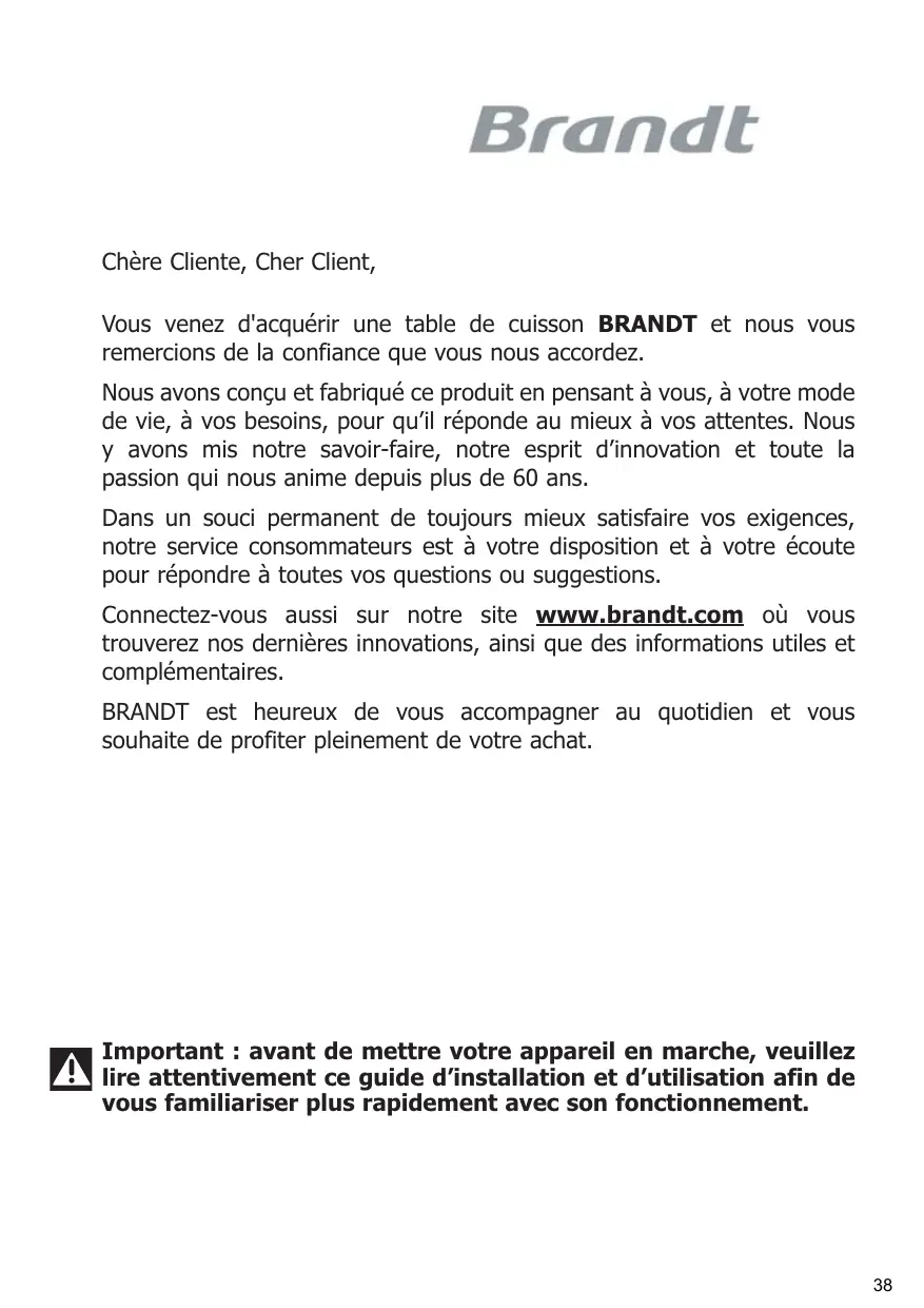 Vous venez d'acquérir une table de cuisson BRANDT et nous vous remercions de la confiance que vous nous accordez.
