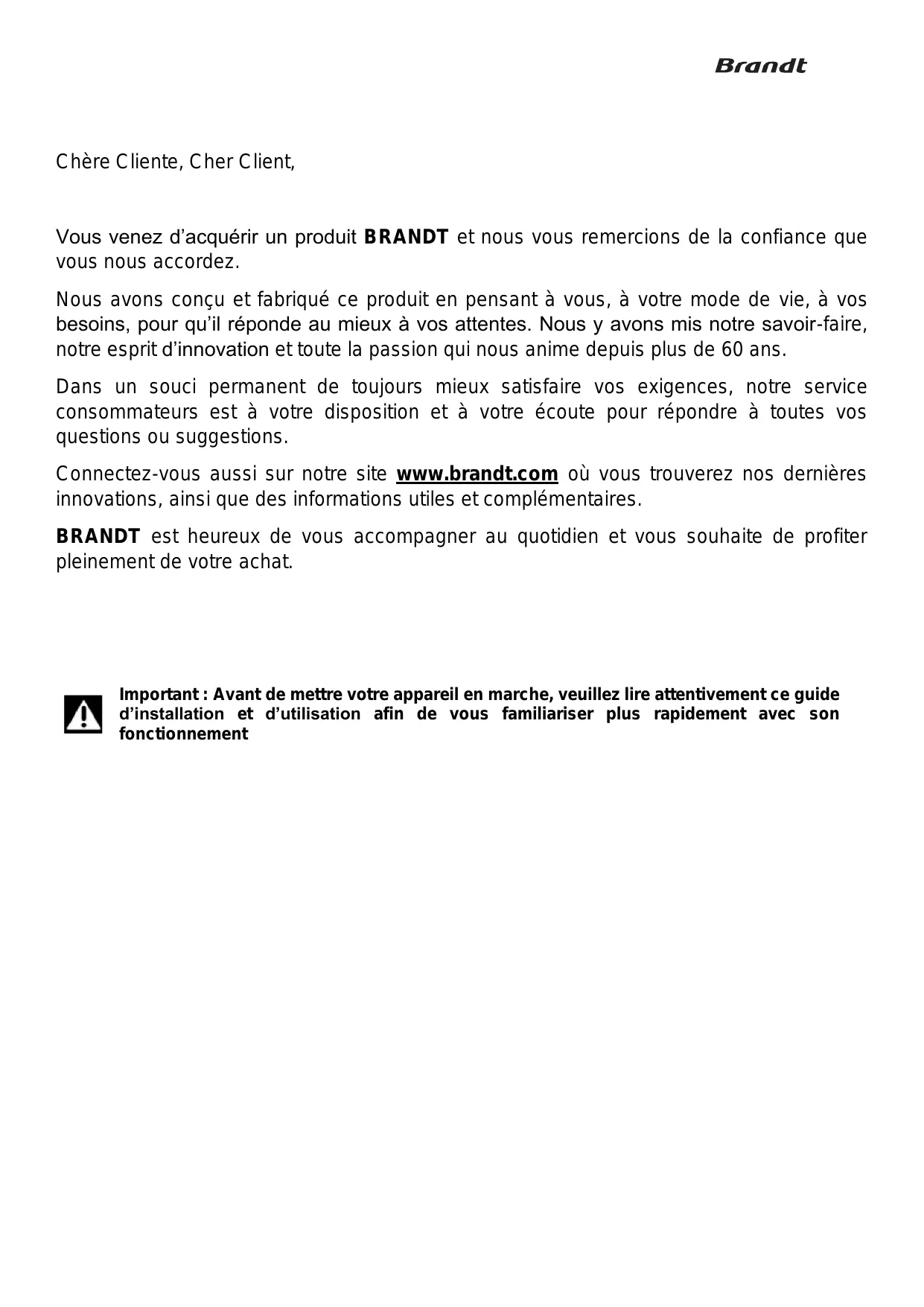 Vous venez d'acquérir un produit BRANDT et nous vous remercions de la confiance que vous nous accordez.