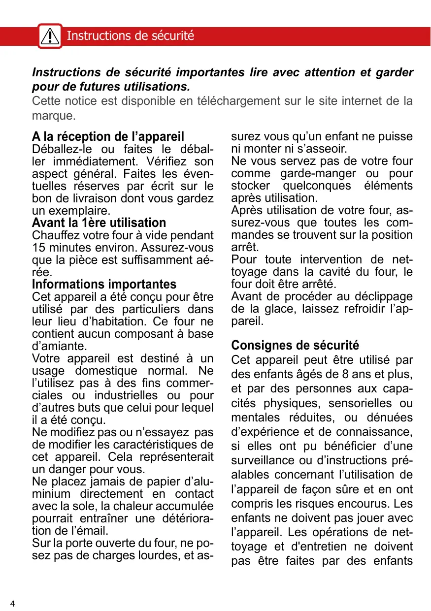 Cet appareil peut être utilisé par des enfants âgés de 8 ans et plus, et par des personnes aux capa- cités physiques, sensorielles ou mentales réduites, ou dénuées d'expérience et de connaissance, si elles ont pu bénéficier d'une surveillance ou d'instructions pré- alables concernant l’utilisation de l'appareil de façon sûre et en ont compris les risques encourus. Les enfants ne doivent pas jouer avec l'appareil. Les opérations de net- toyage et d'entretien ne doivent pas être faites par des enfants