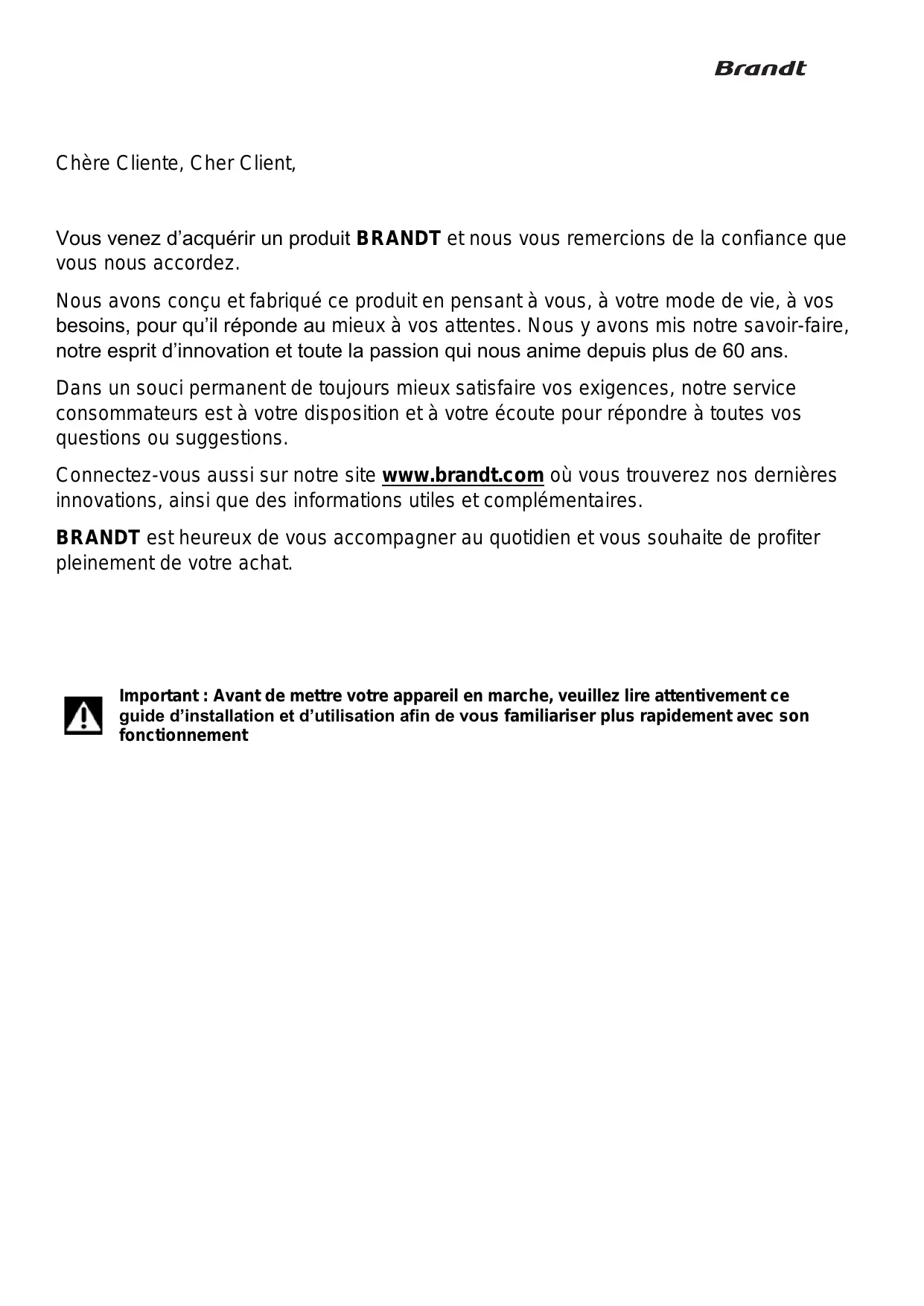 Brandt Chère Cliente, Cher Client, Vous venez d'acquérir un produit BRANDT et nous vous remercions de la confiance que vous nous accordez. Nous avons conçu et fabriqué ce produit en pensant à vous, à votre mode de vie, à vos besoins, pour qu'il réponde au mieux à vos attentes. Nous y avons mis notre savoir-faire, notre esprit d'innovation et toute la passion qui nous anime depuis plus de 60 ans. Dans un souci permanent de toujours mieux satisfaire vos exigences, notre service consommateurs est à votre disposition et à votre écoute pour répondre à toutes vos questions ou suggestions. Connectez-vous aussi sur notre site www.brandt.com où vous trouverez nos dernières innovations, ainsi que des informations utiles et complémentaires. BRANDT est heureux de vous accompagner au quotidien et vous souhaite de profiter pleinement de votre achat. Important : Avant de mettre votre appareil en marche, veuillez lire attentivement ce guide d’installation et d’utilisation afin de vous familiariser plus rapidement avec son fonctionnement