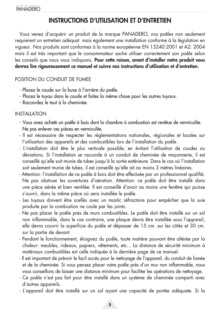 - Pendant le fonctionnement, éloignez du poêle, toute matière pouvant être altérée par la chaleur: meubles, rideaux, papiers, vêtements, etc. La distance de sécurité minimum à matériaux combustibles est celle indiquée à la dernière page de ce manuel.
