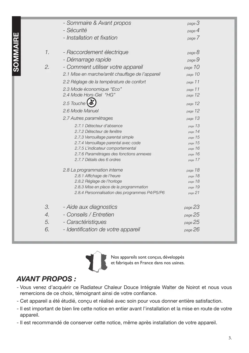 - Aide aux diagnostics - Conseils / Entretien - Caractéristiques - Identification de votre appareil Nos appareils sont conçus, développés et fabriqués en France dans nos usines. AVANT PROPOS : - Vous venez d'acquérir ce Radiateur Chaleur Douce Intégrale Walter de Noirot et nous vous remercions de ce choix, témoignant ainsi de votre confiance. - Cet appareil a été étudié, conçu et réalisé avec soin pour vous donner entière satisfaction. - Il est important de bien lire cette notice en entier avant installation et la mise en route de votre appareil. - ILest recommandé de conserver cette notice, même après installation de votre appareil.