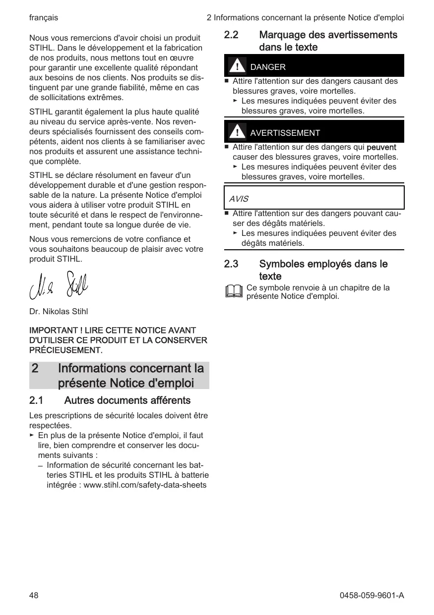 STIHL se déclare résolument en faveur d'un développement durable et d'une gestion respon- sable de la nature. La présente Notice d'emploi vous aidera à utiliser votre produit STIHL en toute sécurité et dans le respect de l'environne- ment, pendant toute sa longue durée de vie.